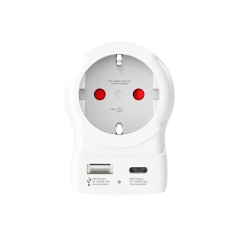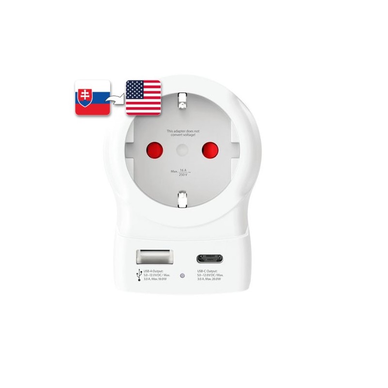 Spoľahlivé pripojenie na cestách Adaptér SKROSS Europe to USA USB AC20PD umožňuje bezpečné použitie európskych zariadení v zásuvkách Spojených štátov a krajinách s USA štandardom typ B. Pripojí uzemnené aj neuzemnené vidlice prívodných káblov, bez problémov zapojíte všetko od notebookov až po fény. Výkonné USB porty vedia nabíjať až 20 W na USB-C a 18 W na USB-A a rýchlo doplniť energiu telefónom, tabletom a ďalšej elektronike. A bez nutnosti odpájať prívodnú šnúru z hlavnej zásuvky.Bezpečný a kvalitný švajčiarsky dizajn Patentovaná konštrukcia s ergonomickým tvarom zaisťuje jednoduché používanie. Adaptér je vybavený detskými poistkami a spĺňa najvyššie bezpečnostné štandardy.Kompaktný, ľahký a ideálny na cesty Vďaka nízkej hmotnosti nezaberie v batožine takmer žiadne miesto. Ideálnym spoločník pre všetkých cestovateľov, ktorí chcú mať istotu, že svoje zariadenia môžu používať bez obmedzenia. Švajčiarska kvalita a jednoduché použitie robia z tohto adaptéra perfektného parťáka na cesty.cestovný adaptér s uzemnením, max. 15A integrovaná USB A+C rýchlonabíjačka 20W PD Power Delivery skracuje dobu nabíjania mobilných zariadení výhodné spojenie dvoch zariadení v jednom pre obyvateľov Európy, navštevujúcich Spojené štáty americké a krajiny s USA štandardom, zásuvky typ B Schuko uzemnenie zásuvky - univerzálne pre prívodné káble spotrebičov s európskou uzemnenou vidlicou typ E/F aj neuzemnenou vidlicou typ C ochranná konštrukcia na zaistenie bezpečného zasunutia / vysunutia vidlice prívodnej šnúry ochranné detské poistky v zásuvke USB nabíjačka: USB-A QC 3.0: 5.0V/3.0A, 9.0V/2.0A, 12.0V/1.5A,18W USB-C PD: 5.0V/3.0A, 9.0V/2.22A, 12.0V/1.67A, 20W PD pri súčasnom nabíjaní USB A+C je nabíjací výkon 5V / 3A, max. 15W bezpečná konštrukcia, najvyššia ochrana užívateľa švajčiarska kvalita a design adaptér nie je prevodníkom napätia ani iných elektrických vlastností 100V - 250V / max. 15A max. 1800W / 120V, max. 3450W / 230V farba: biela