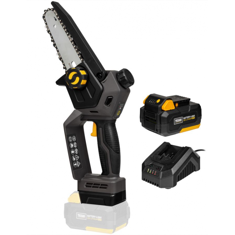 V balení nájdete všetko potrebné na okamžité začatie práce: pílu TEXAS CHX2000, 20V/4,0Ah akumulátor, nabíjačku a ochranné puzdro na lištu. Môžete začať pracovať hneď po vybalení!