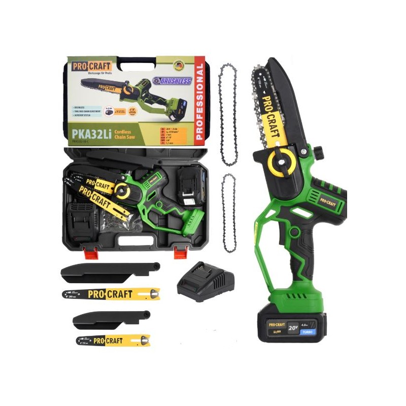 Aku ručná píla Procraft PKA32Li je výkonná a kompaktná píla určená na presné rezanie dreva, konárov a menších konštrukcií. Vďaka bezuhlíkovému motoru, automatickému mazaniu reťaze a jednoduchému napínaniu bez použitia náradia je ideálnou voľbou pre profesionálne aj domáce použitie.