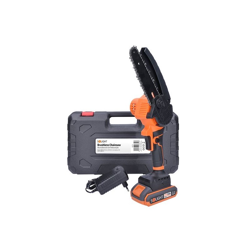 Ručná akumulátorová reťazová píla, 150 mm Ručná akumulátorová reťazová píla s bezuhlíkovým motorom a ručným olejovým čerpadlom na jednoduché mazanie reťaze. Vďaka hliníkovej lište, nízkej hmotnosti (1,1 kg) a jednoduchej obsluhe a údržbe je táto píla ideálna na prerezávanie stromov a kríkov. Dĺžka lišty 100 mm, rýchlosť rezania 5 m/s. Súčasťou balenia je: plastový kufor, 1x 2Ah batéria, nabíjačka, skrutkovač, uťahovací kľúč a návod. Bezpečnostná poistka proti náhodnému spusteniu a zábrana proti dotyku reťaze pre bezpečnosť. Napájanie Li-Ion akumulátor 21 V 2Ah, čas nabíjania cca 150 min. Rozmery s batériou: 36 x 12 x 10,5 cm.akumulátorová reťazová píla bezuhlíkový motor – mimoriadne vysoká životnosť vďaka nízkemu opotrebovaniu, hliníková lišta integrovaná ručná olejová pumpa pre ľahké mazanie reťaze veľmi jednoduché ovládanie a údržba, nízka hmotnosť (1,2kg bez batérie) protišmyková úprava rukoväte vhodná na prerezávanie stromčekov a kríkov súčasťou balenia: plastový kufor, 1x Li-Ion batéria 21V 2Ah, nabíjačka, skrutkovač, návod dĺžka lišty: 150mm výkon motora: 630 W rezná rýchlosť: 5 m/s poistka proti náhodnému spusteniu, zábrana proti kontaktu s reťazou možno dokúpiť 2Ah, 4Ah alebo 6Ah batérie (RN-B2, RN-B4 alebo RN-B6) doba nabíjania 2 Ah batérie: cca 150min možno dokúpiť rýchlonabíjačku Solight RN-RNB rozmery s batériou: 42*12*10,5cm