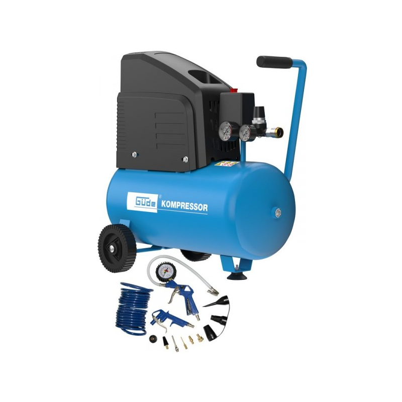 Jednovalcový bezolejový piestový kompresor s priamym pohonom, dva manometre (manometer na meranie tlaku v nádobe a manometer na meranie pracovného tlaku), redukčný ventil, 1 spojka na stlačený vzduch, bezpečnostný ventil a kondenzačná výpustná skrutka, integrovaný vzduchový filter. Transportná rukoväť, gumový doraz pre stabilnú pozíciu, plastové kolesá. Súprava pneumatického náradia: 5-metrová PU hadica odolná voči polámaniu s DL spojkou, vyfukovacia pištoľ, hustilka na pneumatiky, mosadzný adaptér na ventily, adaptér na nafukovanie matracov, mosadzná ihla na nafukovanie lopty, kužeľovitá mosadzná univerzálna tryska, adaptér na trysky z plastu, trysky z plastu na nafukovanie člnov, trysky z plastu na nafukovanie matracov, plastová špicatá tryska.Sieťové pripojenie: 230 V Frekvencia: 50 Hz Druh ochrany: IP20 Otáčky motora: 2800 min-1 Výkon motora (P1): 1,5 kW Maximálny sací výkon: 220 l/min. Skutočné dodávané množstvo 0 bar: 150 l/min. Skutočné dodávané množstvo 4 bar: 110 l/min. Skutočné dodávané množstvo 7 bar: 92 l/min. Maximálny tlak: 8 bar Objem nádoby: 24 l Počet valcov: 1 Počet spojok stlačeného vzduchu: 1 Dĺžka prípojného kábla: 1500 mm Hladina akustického výkonu LWA: 96 dB Rozmery (DxŠxV): 550 x 315 x 565 mm Hmotnosť netto/brutto: 22 kg/24 kg