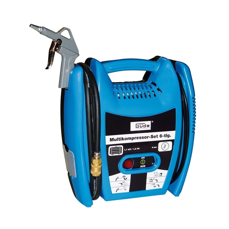 Sada prenosného piestového bezolejového kompresora s najčastejšie používaným hobby príslušenstvom: vyfukovacia pištoľ, hustilka pneumatík a komplet adaptérov (na nafukovanie lôpt, matracov a pneumatík), určená servisným technikom (napr. na ofukovanie elektrických prístrojov alebo PC, sponkovanie atď.), ale i k bežnému domácemu použitiu. Vybavenie: 2,5 m tlaková hadica s rýchlospojkou, box na príslušenstvo, transportná rukoväť. Prípojka: 230 V~50 Hz Výkon motora (P1/S3/15%):1,1 kW Maximálny sací výkon: 180 l/min. Skutočné dodávané množstvo vzduchu: 140 l/min. Max. tlak: 8 bar Počet valcov: 1 Hladina hluku LWA: 97 dB (A) Hmotnosť: 5,5 kg