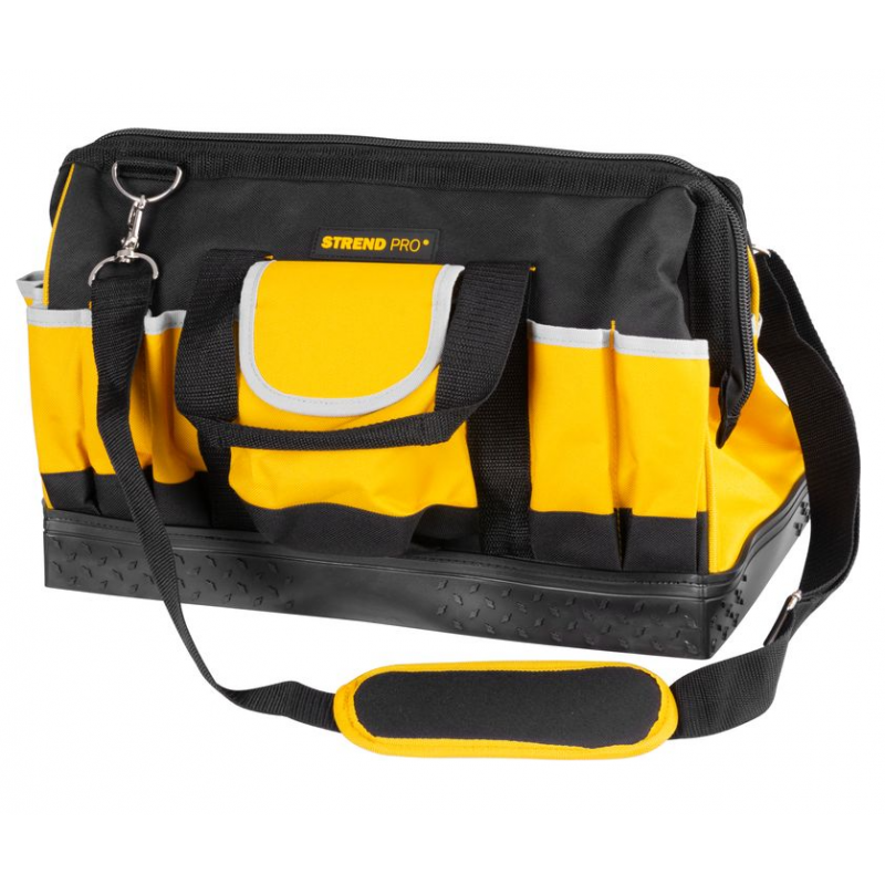 Praktická brašňa Strend Pro na ťažké náradie je praktickým pomocníkom pre každého majstra a kutila. Má vystuženú pogumovanú spodnú časť, ktorá je odolná voči špine a zabezpečuje lepšiu nosnosť a odolnosť. Obsahuje množstvo bočných vreciek na uloženie menšieho náradia. Pripojiteľný ramenný popruh pre komfortné prenášanie. Uzatvárateľná zipsom. Maximálna nosnosť: 20 kg. Rozmery: 44x25x24 cm.