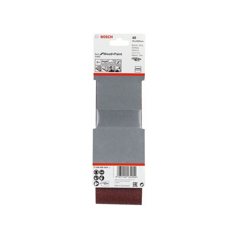 Brúsne pásy Bosch pre pásové brúsky na brúsenie dreva, drevotrieskových, stavebných dosiek a farby.Rozmery pásu, šírka mm: 75 Rozmery pásu, dĺžka mm: 533 Zrnitosť: 40 Počet ks v balení: 3