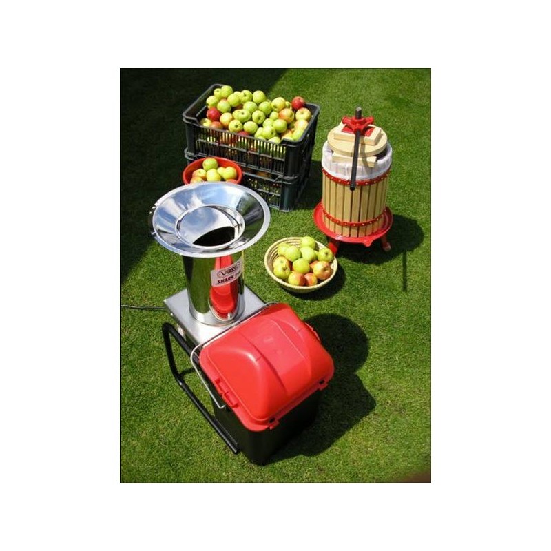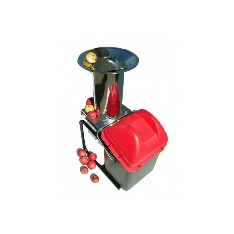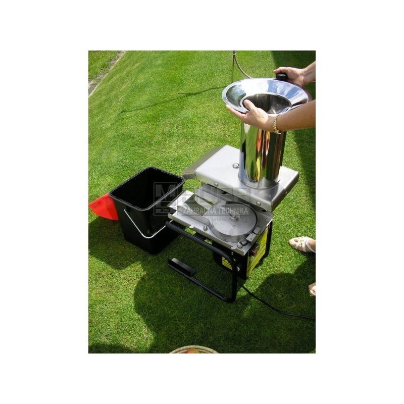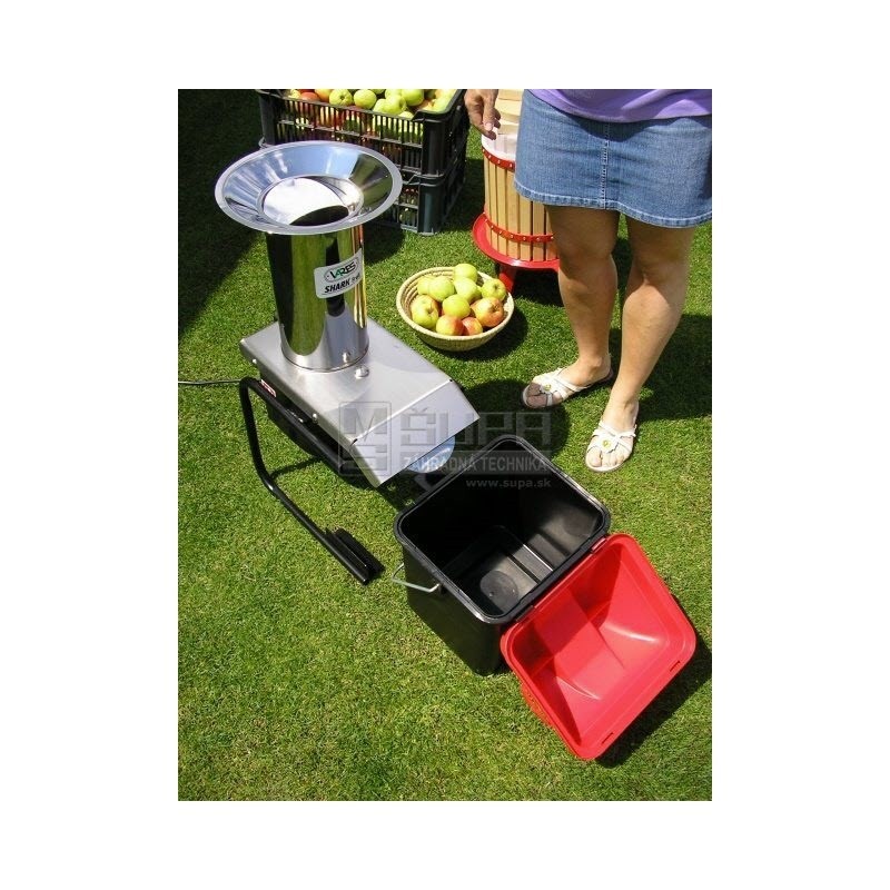 Tubus a drviace ústrojenstvo tohto vynikajúceho pomocníka je vyrobené z vysoko kvalitnej potravinárskej nerezovej ocele. Použitá nerezová oceľ zaisťuje absolútne hygienický prevádzku, pekný vzhľad, veľmi vysokú odolnosť a tiež dlhú životnosť tohto stroja. Motor drviča má výkon 1,6 kW (230V). Drvič SHARK Fruit je určený na spracovanie ovocia, predovšetkým jabĺk, hrušiek ale aj ďalších ovocných plodov (vrátane kôstkovín) určených na lisovanie (muštovánie) alebo ďalšiemu inému spracovaniu. V drviči SHARK Fruit je možné spracovávať celé plody a to až do priemeru 100 mm. Ovocie sa veľmi rýchlym a jednoduchým spôsobom "nadrví" na malé kúsky, ktoré sa potom veľmi ľahko vylisujú. Ovocie je nadrtené (nasekané / rozmixované) na veľmi jemné čiastočky plné ovocnej šťavy. Spracovaním ovocia v drviči SHARK Fruit je tak zaistené ľahšie a efektívnejšie získanie ovocnej šťavy pri následnom lisovaní. Drvič SHARK Fruit tak veľmi efektívnym spôsobom nahrádza inak veľmi zdĺhavú prípravu ovocia (strúhanie alebo iné delenie) pred jeho vlastným lisovaním. Ovocie sa do drviča vkladá jeho násypkou. Ideálnym riešením je vysypávať ovocie do drviča priamo z vedra alebo prepravky. Násypkou potom ovocie rovnomerne prepadáva na nerezový kotúč opatrený rezným nožom a nerezovou "vrtuľkou", kde je spracovávané. Rovnomerné prepadávanie ovocia tubusom drviča je ovplyvňované tromi (opäť nerezovými) prepážkami. Rozdrvené ovocie je transportované do nádoby s využiteľným objemom 20 l, ktorá je súčasťou drviča. Nádoba je zaistená proti eventuálnemu pohybu pomocou držadla nádoby, ktoré je zabezpečené na tele drviča. Obsah nádoby je možné kontrolovať kedykoľvek počas prevádzky stroja odklopením jej veka. Odklopenie veka nemá žiadny vplyv na chod alebo bezpečnosť stroja. Po naplnení nádoby rozdrveným ovocím sa nádoba vyberie ťahom vpred (naznačené šípkou). Veko nádoby je možné jednoducho zaistiť pomocou držadla nádoby. Po vybratí nádoby sa pomocou bezpečnostnej záklopky automaticky uzavrie priestor pod drvičom. Tým je zabránené eventuálnemu nebezpečenstvo úrazu obsluhy stroja (vloženie ruky do bežiaceho stroja). Pre pokračovanie v práci sa nádoba opäť nasunie späť pod drvič. Na oporných nohách drviča sú koľajničky, ktoré usmerňujú a uľahčujú vybratie a opätovné nasadenie nádoby. Drvič SHARK Fruit je naozaj rýchlym a predovšetkým výkonným pomocníkom všetkých záhradkárov.