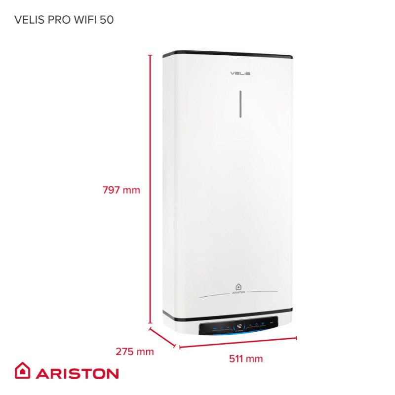 Wi-Fi ohrievač vody Ariston Velis Pro WiFi sa vyznačuje kompaktným dizajnom so super plochým plášťom s hĺbkou iba 27 cm, čo umožňuje jeho umiestnenie aj do malej kúpeľne alebo inej miestnosti.