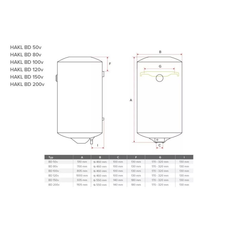Elektrické zásobníkové ohrievače HAKL BD 50v s objemom vody 50 litrov. Tieto ohrievače patria do produktovej rady tlakových zásobníkov s oceľovou nádobou. Doplnkové označenie „V“ (BDv), znamená vertikálne (zvislé) prevedenie s valcovitým dizajnom, preto regulácia teploty ohrevu vody a pripojovacie vývody ohrievača sa nachádzajú na spodnej strane krytu. Súčasťou balenia zásobníkových ohrievačov vody HAKL BDv je aj poistný ventil a univerzálna konzola na zavesenie ohrievača.