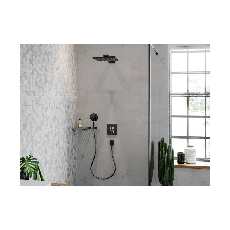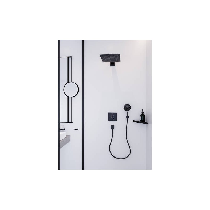 Dažďová sprcha hansgrohe Raindance E 300 (1 typ prúdu) s ramenom sprchy v matne čiernej farbe pre nástennú montáž ponúka uvoľňujúci pôžitok z vody, moderný dizajn a peknú farbu. Horná sprcha s veľkosťou 300 × 300 mm zaujme štvorcovým tvarom a štíhlou siluetou, takže ide o perfektný doplnok modernej kúpeľne. V spojení s kvalitným a trvanlivým povrchom v trendovej matne čiernej farbe je táto sprchová hlavica výrazným dizajnovým prvkom, ktorý sa veľmi dobre hodí k modernej architektúre. Vďaka jemnému typu prúdu RainAir (1jet) s prietokovým množstvom max. 19 l/min (pri tlaku 3 bar) dokáže táto sprcha zahaliť telo zamatovo jemnými kvapkami vody. Ďalšie plus: Sprchová hlavica automaticky obohacuje vytekajúcu vodu vzduchom – pre príjemný pocit z vody (AirPower).