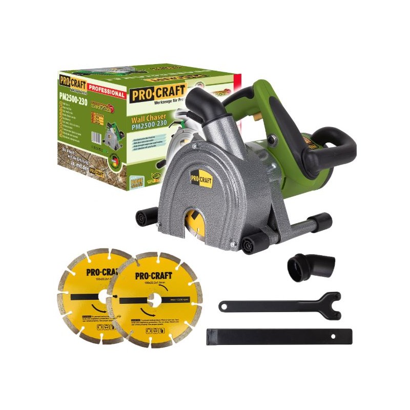 Fréza na drážky do muriva Procraft PM2500-230 je určená na frézovanie drážok pre elektroinštaláciu a vodovodné káble v stenách z tehál, betónu a pórobetónu. Výkonný motor s príkonom 1700 W a 4500 otáčkami za minútu zaručuje vysoký výkon. Možnosť pripojenia vysávača prostredníctvom hadice, ktorá je súčasťou zariadenia, zaručuje čisté pracovné prostredie. Funkcia pomalého štartu zabezpečuje dlhú bezproblémovú prevádzku. Plynulé nastavenie hĺbky a šírky rezu zaručuje vysokú presnosť drážkovania. Súčasťou dodávky je kotúč, montážny kľúč. Balenie v kartóne.