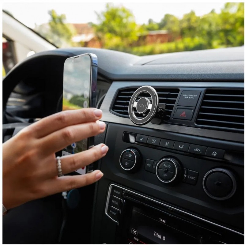 Vlastnosti: -magnetický držiak s funkciou MagSafe -na pripevnenie do mriežky ventilácie -navrhnutý priamo pre Apple iPhone série 12 a vyššie -špeciálna nalepovacia podložka na použitie s ostatnými telefónmi bez MagSafe -18 integrovaných magnetov po obvode -uťahovacie kliešte s istiacim hákom pre pevné uchytenie do ventilácie -vhodné pre väčšinu ventilačných mriežok automobilu -bezpečne udrží vložený telefón aj pri najväčších otrasoch -otočný kĺb na nastavenie do ideálneho pozorovacieho uhla