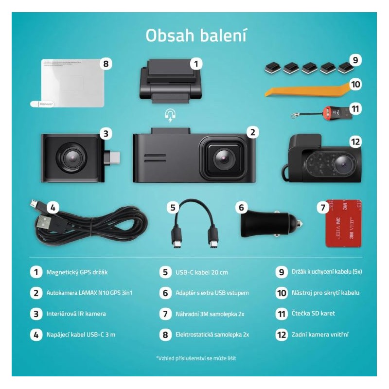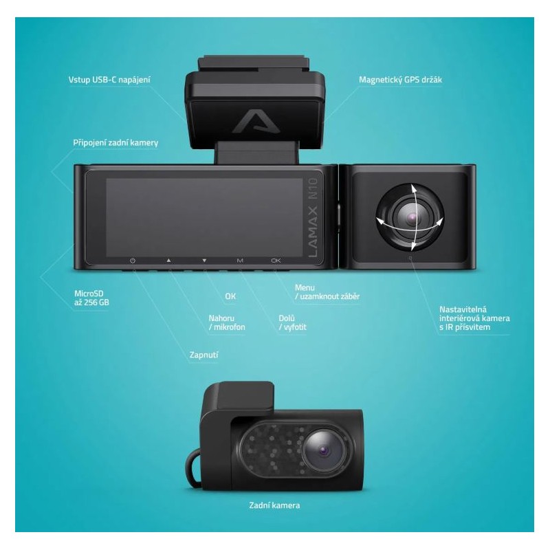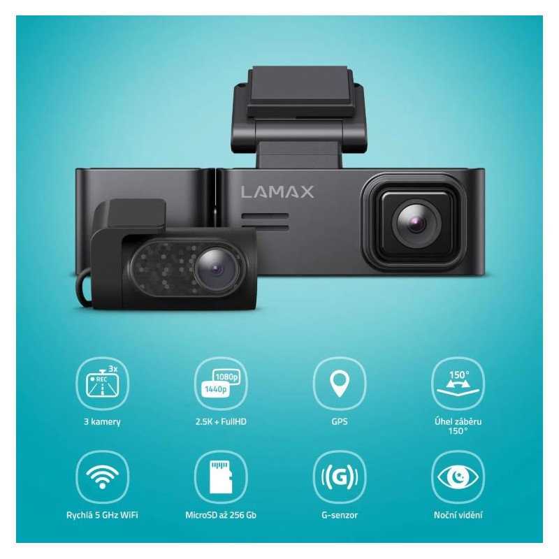 LAMAX N10 GPS 3in1 Tri kamery, čo zaistia tú najlepšiu ochranu Predierať sa každodenne dopravnou džungľou chce nielen pevné nervy, ale aj parťáka, ktorý ti kryje chrbát. Najrôznejšie nástrahy číhajú všade, či už nehody alebo vandalstva, LAMAX N10 GPS 3in1 zariadi, že budeš mať vždy v ruke dôkaz, čo sa naozaj stalo. Tento 3-kamerový systém pre tvoje auto totiž ako jeden z mála na trhu súčasne nahráva dianie vpredu , vzadu aj v interiéri . Zhotovené zábery majú vysoké rozlíšenie , a to z každej kamery. Interiérová je navyše vybavená infrared prísvitom pre zreteľný záznam aj v šere av noci. Vďaka zabudovanej GPS v držiaku sa do videa môžu prepísať údaje o polohe a G-senzor sa postará, že sa pri prípadnej udalosti zábery automaticky uzamknú . To je možné vykonať aj manuálne. Stiahnutie záberov funguje cez aplikáciu bleskovo, poďakovať za to môžeš 5GHz Wi-Fi . Pokojne ich ale nechaj na karte , ktorá poberie až 256 GB vo vysokom rozlíšení. Značnú kvalitu majú aj nočné videá. Kamera bude tvojím parťákom fakt dlho, namiesto batérie má totiž superkondenzátor . V nadupanej výbave potom nájdeš napájací adaptér a nabíjať ide cez USB-C . Toto pomocníka skrátka potrebuješ. Viac kamier viac vidí Či už chceš ustrážiť svoju káru, mať väčšiu istotu ako otec od rodiny alebo si vodič taxi a chceš byť v rôznych situáciách pripravený, táto kamera ti vždy bude kryť chrbát. S 3-kamerovým systémom budeš mať dôkaz pri nehode alebo vandalizmu ak tomu zo všetkých možných strán a uhlov. Zo všetkých troch kamier v balení – prednej , zadnej aj interiérovej – môžeš robiť záznam súčasne av top kvalite . Predné nahráva až v 4K , predné a zadné v 4K a Full HD a predné, zadné a interiérové až v 2.5K, Full HD a Full HD. Kamery robia aj kvalitné nočné video , pričom interiérová je vybavená infrared (IR) prísvitom , ktorý prepne záznam do čiernobieleho módu s dobrou viditeľnosťou. Zábery pod ochranou Pokiaľ dôjde k nehode alebo podobnej udalosti, G-senzor zariadi automatické uzamknutie záberov , ktoré potom poslúži ako dôkaz. Keď ale potrebuješ, stlačením tlačidla uzamkneš zábery aj manuálne . Dôkazný materiál bude ešte silnejší vďaka zabudovanej GPS v držiaku , ktorá umožňuje prepísanie polohy do videa. Zvuk je štandardne zapnutý, ale rýchlou voľbou je možné mikrofón vypnúť. Všetky zábery si potom stiahneš cez aplikáciu , a to rýchlosťou blesku, za čo môže 5GHz Wi-Fi . Celé menu je v češtine , nastavenie kamery zvládneš na pohodu. Aby kamera držala na svojom mieste, istí magnetický systém držiaka kamery so samolepkou. Veľká kapacita aj životnosť Záznamov sa ti na až 256GB pamäťovú kartu zmestí veľa, navyše vo vysokom rozlíšení . Kamera bežne nahráva automaticky v slučke s nastaviteľnou dĺžkou záznamu, ale zábery môžeš aj uzamknúť. Je vybavená odolným superkondenzátorom zaisťujúcim dlhú životnosť. Kamera je napájaná cez moderný USB-C konektor . Napájací adaptér okrem portu pre kameru disponuje aj portom s podporou fast-charge , aby si mohol napríklad rýchlo dobiť mobil. 3-kamerový systém Veľkou prednosťou kamery, ako jednej z mála na trhu, je podpora súčasného nahrávania všetkých troch kamier. Predná, zadná aj interiérová kamera sa nachádzajú v balení. Vysoké rozlíšenie Predná kamera nahráva až v 4K , predná a zadná v 4K a Full HD a predná, zadná a interiérová až v 2.5K, Full HD a Full HD. Nočný režim Všetky kamery robia veľmi kvalitné nočné video. Interiérová je navyše vybavená IR prísvitom, takže ako sa zošerí, prepne do čiernobielej farby a interiér vozidla zostáva dobre viditeľný. Uzamknutie záberov Ak dôjde k udalosti, G-senzor automaticky uzamkne zábery proti prepísaniu. Uzamknutie je možné aj manuálne. GPS v magnetickom držiaku V magnetickom držiaku kamery so samolepkou je zabudovaná GPS, vďaka čomu je možné mať vo videu zapísanú aktuálnu polohu. Vďaka magnetu, môžeš striedať autá a držiaky. Wi-Fi 5GHz Wi-Fi zaručuje veľmi rýchle stiahnutie zhotovených záberov. Jej rýchlosť niekoľkonásobne prevyšuje 2.4 GHz.