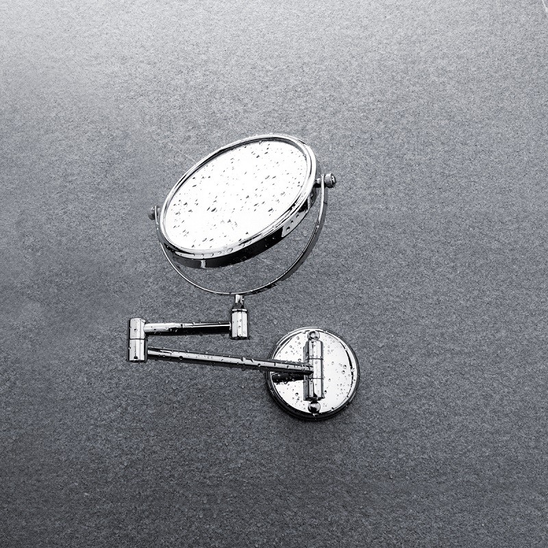 Stojankové kozmetické zrkadlo.-Z mosadze, -Povrch: Chróm, -Otočná hlava, -Z jednej strany 3x zväčšovacie, -Priemer 20cm, ,NIMCO.