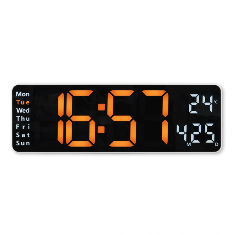 Popis: - moderné hodiny s minimálnym obvodovým rámom a dvojfarebným displejom - nástenné alebo stolné hodiny s digitálnym zobrazením času, dátumu, dňa v týždni a teploty - mimoriadne veľký a prehľadný LED displej - integrovaná funkcia časovača a stopiek - 10 stupňov jasu displeja jednoducho nastavte podľa aktuálnych podmienok a potrieb - diaľkový ovládač pre rýchle nastavenie jednotlivých funkcií aj na diaľku (napr. časovač, stopky, budík) - možnosť nastavenia dvoch časov budenia, ideálne pre osoby, ktoré vstávajú v rozdielny čas - nastavenie budíka pre pracovné dni, takže budík bude aktívny od pondelka do piatku - svetelný senzor s možnosťou vypnutia/zapnutia, ktorý sa automaticky aktivuje v šere alebo tme - intuitívne ovládanie pomocou diaľkového ovládača a tlačidiel na zadnej strane hodín - napájanie - hodiny: sieťový zdroj IN: 100-240 V/50/60 Hz OUT: 5 V/1 A/5 W (súčasť balenia) - napájanie - diaľkový ovládač: 1 gombíková batéria CR2025 - rozmery (Š x V x H): 32 x 10 x 3 cm - hmotnosť: 344 g - materiál: plast - farba rámu/displeja: biela/čierna - farba číslic, písmen: biela/oranžová - balenie: papierová krabička bez obsahu plastov, s certifikovaným pôvodom drevaTeplomer: - zobrazenie vnútornej teploty vzduchu - možnosť prepnutia medzi stupňami Celzius a Fahrenheit - rozsah merania (vnútorná teplota): 0°C až +50°CČas, dátum, budík: - možnosť nastavenia 12/-24-hodinového zobrazenia formátu času - zobrazenie skratky dňa v týždni v angličtine - možnosť nastavenia dvoch rôznych časov budenia (ideálne pre dve osoby, ktoré vstávajú v rôzny čas)Obsah balenia: - 1 digitálne hodiny Santa Cruz - 1 sieťový zdroj - 1 diaľkový ovládač - 1 CR2025 gombíková batéria - 1 návod na použitieParametre: Ďalšie funkcie Budík | Dátum | Teplomer (+0°C až +50°C) Displej Digitálny Materiál krytu Plast Materiál plášťa Plast Prevádzkový režim Manuálny Prevedenie Nástenné hodiny | Stolné hodiny Hmotnosť 344 g Rozmer - hĺbka 3 cm Rozmer - šírka 32 cm Rozmer - výška 10 cm Napájanie 100-240 V 50/60 Hz Počet batérií 1 Typ batérie CR2025 Dizajn/motív Čísla Farba ciferníka Čierna Farba krytu Biela