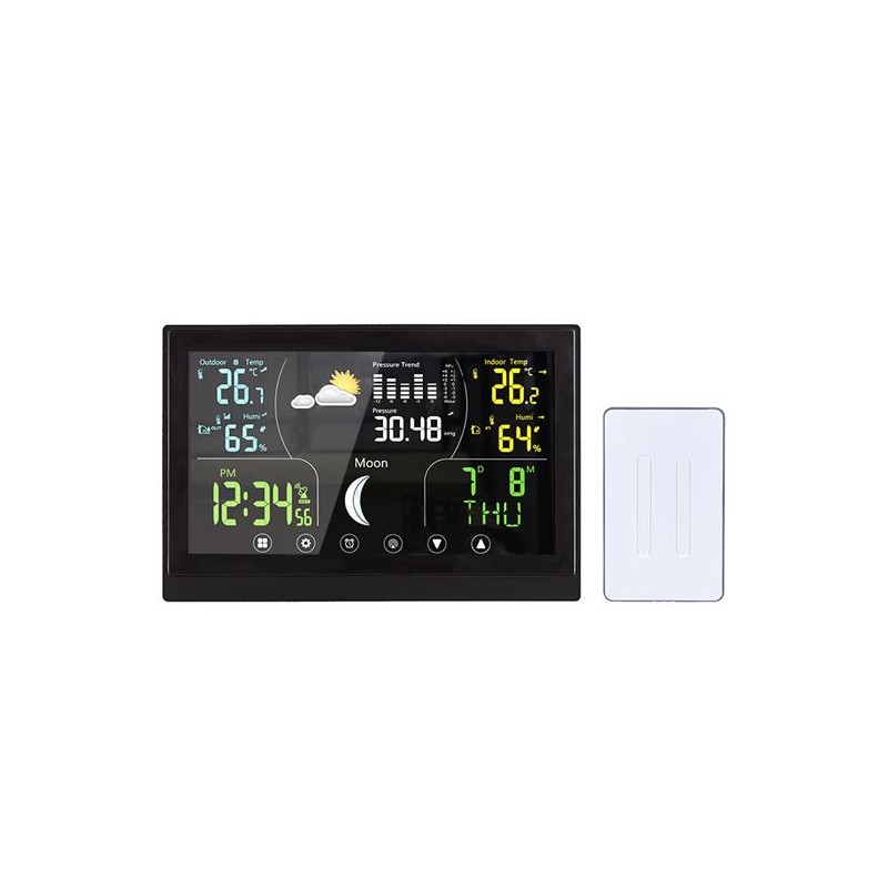vnútorná teplota: -10 °C až +50 °C vonkajšia teplota: -50 °C až +70 °C rozlíšenie teploty: 0,1°C vnútorná aj vonkajšia vlhkosť: 1% až 99% RH rozlíšenie vlhkosti: 1% farebný VA displej s dotykovým ovládaním veľkosť displeja: 168x93 mm možnosť trvalého podsvietenia predpoveď počasia zobrazenie fáz Mesiaca barometer na meranie atmosférického tlaku záznam minimálnych a maximálnych hodnôt teplotná výstraha možnosť nastavenia jednotiek teploty (°C/°F) hodiny riadené DCF signálom funkcia budíka a opakovaného budenia kalendár a dátum korekcia nadmorskej výšky bezdrôtové čidlo s dosahom až 100m (súčasť balenia) možnosť pripojenia až 3 čidiel napájanie hlavnej jednotky: 5V DC/300mA adaptér alebo 3x AAA batérie napájanie čidla: 2x AAA batérie rozmery hlavnej jednotky: 17×192×127mm rozmery čidla: 15x62x100mm farba čiernaTáto meteostanica je vybavená farebným dotykovým displejom VA s rozmermi 168 x 93 mm, ktorý zaručuje vynikajúcu čitateľnosť a intuitívne ovládanie. Vďaka možnosti trvalého podsvietenia je displej prehľadný aj v tme. Displej poskytuje širokú škálu informácií vrátane aktuálnej teploty (vnútorná od -10 °C do +50 °C, vonkajšia od -50 °C do +70 °C), relatívnej vlhkosti (1 % až 99 % RH), atmosférického tlaku a predpovede počasia. Okrem toho zobrazuje fázy mesiaca, kalendár, dátum a hodiny riadené signálom DCF, čím zabezpečuje vždy presný čas. Stanica umožňuje zaznamenávanie minimálnych a maximálnych hodnôt, nastavenie teplotných výstrah, výber jednotiek teploty (°C/°F) a dokonca aj korekciu nadmorskej výšky na presnejšie meranie tlaku. Je vybavená funkciou budíka s možnosťou opakovaného budenia, čo z nej robí praktického pomocníka nielen na monitorovanie počasia, ale aj na každodenné použitie. Bezdrôtový snímač s dosahom až 100 m (je súčasťou dodávky) umožňuje presné meranie vonkajších podmienok a súčasne možno pripojiť až tri snímače. Hlavnú jednotku možno napájať buď adaptérom (5 V DC/300 mA), alebo tromi batériami AAA, zatiaľ čo snímač používa dve batérie AAA. Vďaka kompaktným rozmerom hlavnej jednotky (17 × 192 × 127 mm) a elegantnému čiernemu dizajnu je vhodná do každého interiéru a predstavuje moderný a štýlový doplnok domácnosti.