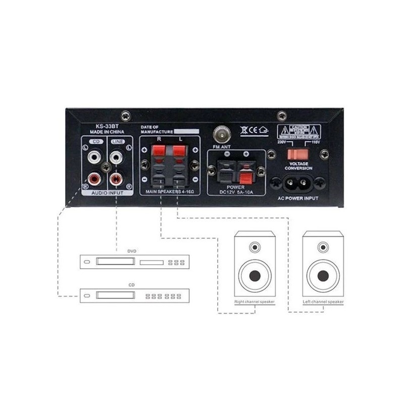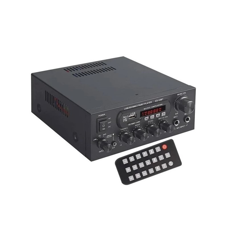 Univerzálny prístroj s možnosťou napájania 230VAC alebo 12–14VDC združujúcou viac funkcií. Nf zosilňovač 2×20W, bluetooth, prehrávač MP3 (slot USB alebo SD), rádio FM, všetko s diaľkovým ovládaním.Technické parametre:Deklarovaný výstupný výkon: 2×60W Odhadovaný výstupný výkon: 2×20W/4ohm Skreslenie: 0,4% Impedancia pripojených reproduktorov: 4–16ohm Odstup s/š: 80dB Vstup line: citlivosť 250mV Vstup MIC: 2×, citlivosť 6mV – pre dynamický mikrofón Rádio: 87,5-108MHz, 50 predvolieb Bluetooth 5.0 Korekcia basy, výšky Hlasitosť pre mikrofón – možnosť mixovania Rozmery: 180×65×193mm/1,6kg