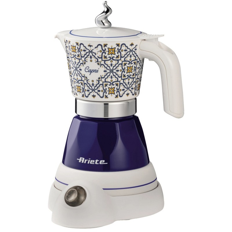 Ariete Capri Moka Aroma 1358/CA Elektrická moka kanvička • 2 – 4 šálky • príkon 400 W • kapacita 160 ml • udržiavanie teploty po dobu 30 minút • izolovaná rukoväť • otočná základňa 360° Pripraví 2 alebo 4 moka šálky Jednoduché ovládanie stlačením tlačidla Príkon 400 W Kapacita kanvice 160 ml Otočná základňa o 360° pre pohodlnú manipuláciu Izolovaná rukoväť pre maximálnu bezpečnosť Funkcia udržiavania teploty kávy po dobu 30 minút