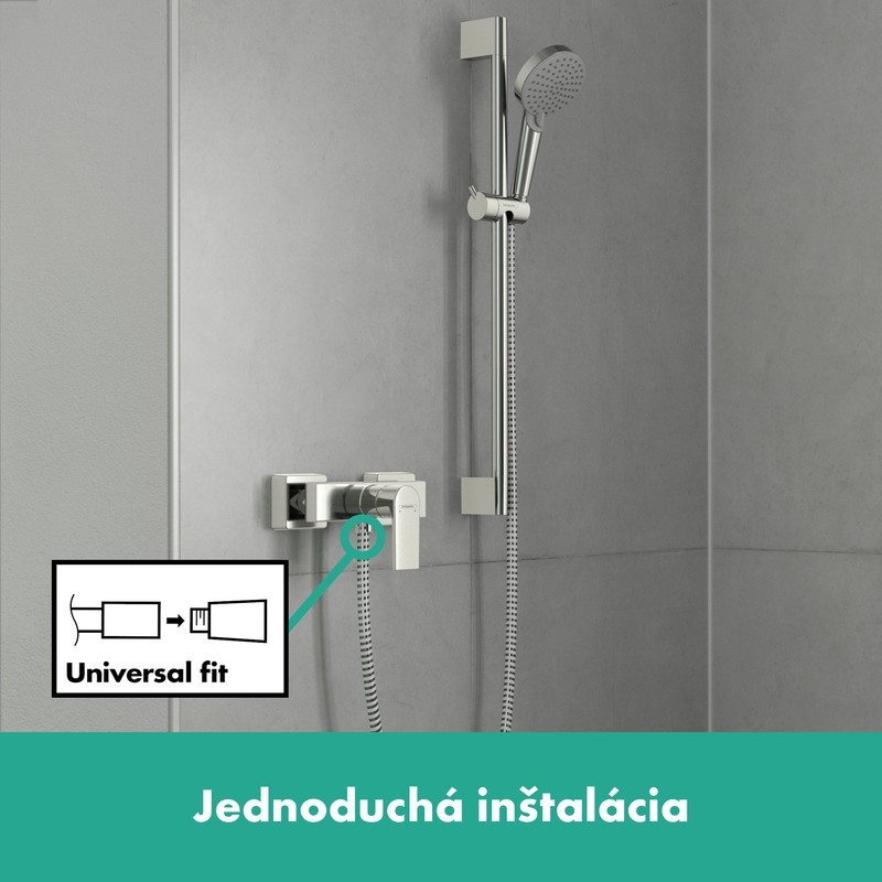 Vďaka svojmu osobitému dizajnu predstavuje páková sprchová batéria Vernis Shape (pre inštaláciu na stenu) perfektné a moderné sprchové riešenie pri minimálnom rozpočte. Páková batéria s inštaláciou na stenu sa skvele hodí na bezproblémovú renováciu kúpeľne. Batériu je možné za chvíľku priskrutkovať na existujúce štandardné etážky (veľkosť G ½, DN15). Takisto ľahké: K vývodu vody pre sprchovú hlavicu je možné pripojiť všetky štandardné sprchové hadice. Vďaka prietokovému množstvu až 15,7 l/min (pri tlaku 3 bary) je táto batéria zárukou takmer okamžitého potešenia z vody v domácej kúpeľni.