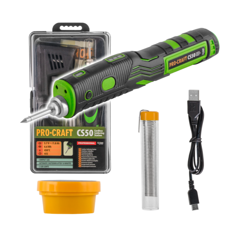 Moderná aku spájkovačka PROCRAFT CS50 vám umožní pracovať kdekoľvek bez obmedzenia napájacím káblom. Vďaka výkonnej Li-ion batérii 3,7 V / 1,8 Ah a rýchlemu zahrievaniu na pracovnú teplotu už za 45 sekúnd je ideálnym pomocníkom pre servisné práce, opravy elektroniky aj hobby projekty. S maximálnou teplotou 450 °C a výkonom 11 W zvládnete presné spájkovanie vodičov, elektronických súčiastok aj jemných komponentov.