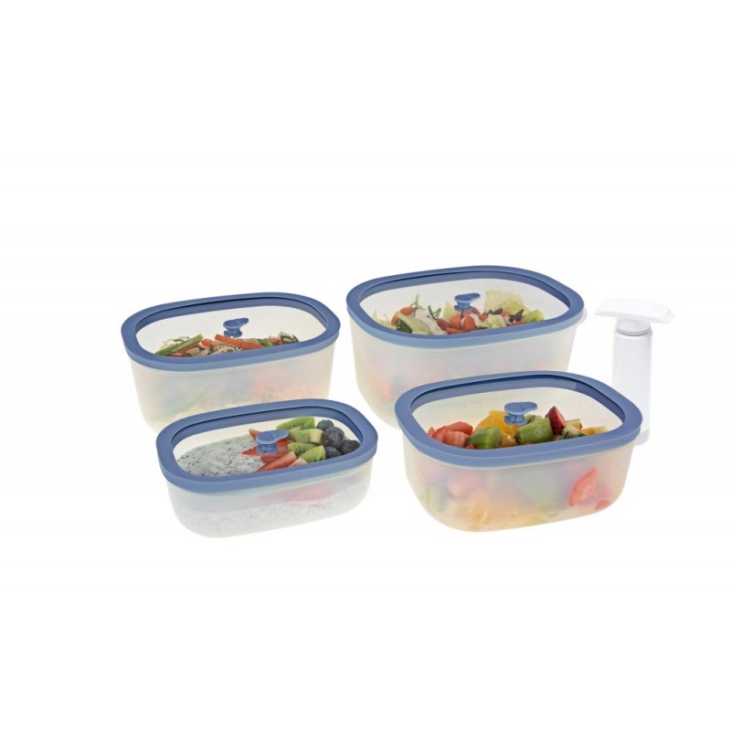 STATUS Fresko 5-dielny set vákuových dóz 177112, modrá Vakuové dózy: 0,5 0,9 1,4 a 2,3 l, dvojstupňová ochrana uzavretia, dóza z pevného a odolného BPA free plastu a skleneného veka, vhodné do umývačky riadu, mrazničky aj mikrovlnky Ideálne na vákuovanie potravín a dlhodobé skladovanie, ale použiť ich môžete aj ako krabičky na obed Dvojitá ochrana proti pretečeniu: vzduchotesný uzáver + vákuum Transparentné sklenené veko uľahčí prehľad nad zásobami Ideálne na cesty Ľahký a odolný PP materiál 5-dielny set dóz s objemom 0,5 0,9 1,4 a 2,3 litra Sú stohovateľné pre optimálne využitie priestoru Dózy sú vhodné do mikrovlnky, mrazničky a umývačky riadu Kompatibilný s ručnou a elektrickou vákuovou pumpou zn.STATUS alebo vákuovačkou potravín s funkciou Canister Predĺžená 3-ročná záruka Vyrobené v Slovinsku