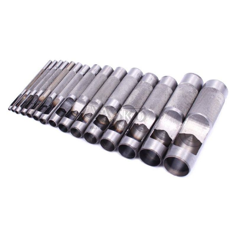 Sada dierovačov vyrobených z kvalitnej uhlíkovej ocele. Vďaka svojmu dizajnu a vrúbkovanej povrchovej úprave zaisťujú presné a efektívne vytváranie otvorov.Tieto dierovače sa používajú predovšetkým v obuvníctve, kožiarstve, sedliarstve a krajčírstve. Vďaka svojej všestrannosti sú vhodné aj na rezanie otvorov do kože, mäkkých plastov, gumy, balzy, peny, kartónu a mnohých ďalších materiálov.Sada obsahuje razníky s priemermi: 2 mm, 2,5 mm, 3,2 mm, 4 mm, 4,8 mm, 5,5 mm, 6,4 mm, 8 mm, 9,5 mm, 11,1 mm, 12,7 mm, 14 mm, 15,8 mm, 19 mm a 22 mm.