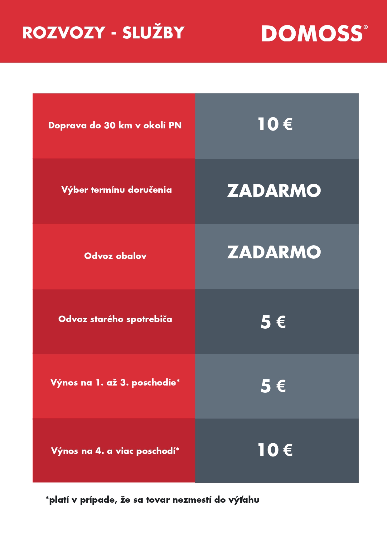 Naším rozvozom si môžete nechať doviezť zakúpený spotrebič priamo až k Vám domov. V prípade dopravy do 30 km v okolí Piešťan je cena za dopravu vo výške 10€. Daný spotrebič v prípade potreby aj vynesieme, zapojíme (nevzťahuje sa na plynové spotrebiče) a starý spotrebič zas odvezieme (práčky odpojí náš vodič, ostatné domáce spotrebiče musia byť odpojené).