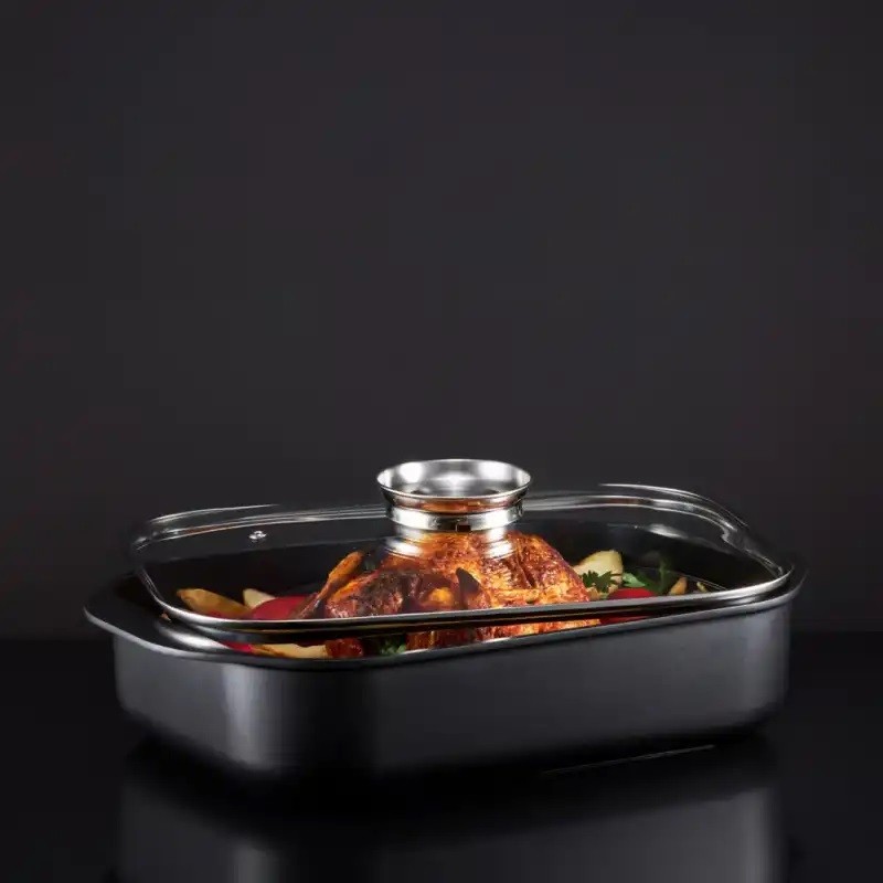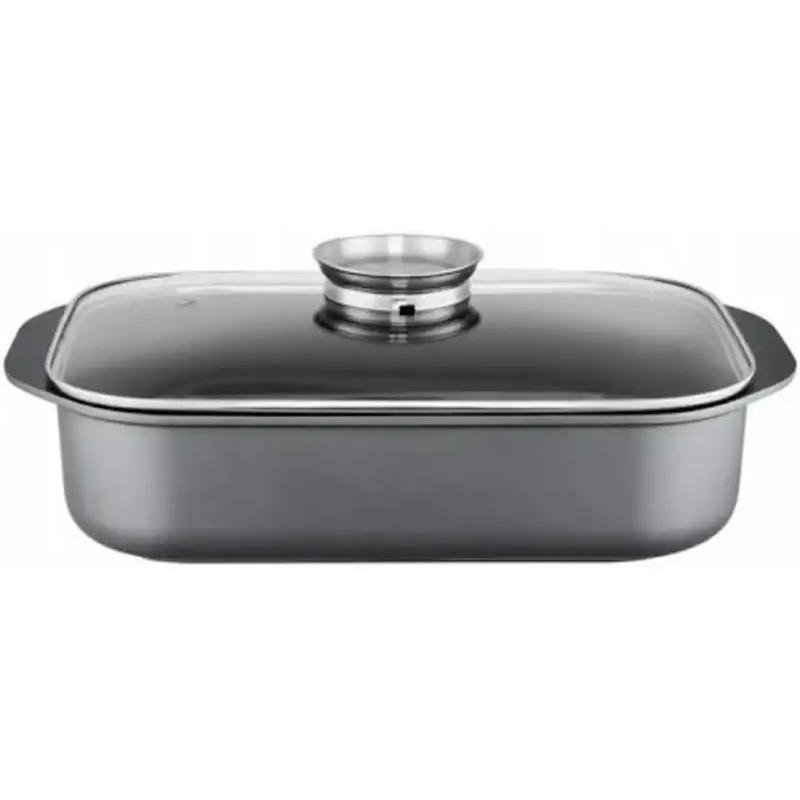 Sklenené veko pekáča je vybavené patentovaným systémom Aroma Knob, ktorý výrazne uľahčuje prácu v kuchyni. Vďaka špeciálnemu otvoru v úchytke pokrievky môžete jednoducho dolievať vodu, víno či iné tekutiny priamo počas pečenia, bez nutnosti zdvíhať pokrievku. Tým sa predchádza úniku tepla a vlhkosti, čo prispieva k lepším chuťovým výsledkom. Sklenená pokrievka zároveň umožňuje sledovať priebeh pečenia bez straty tepla.