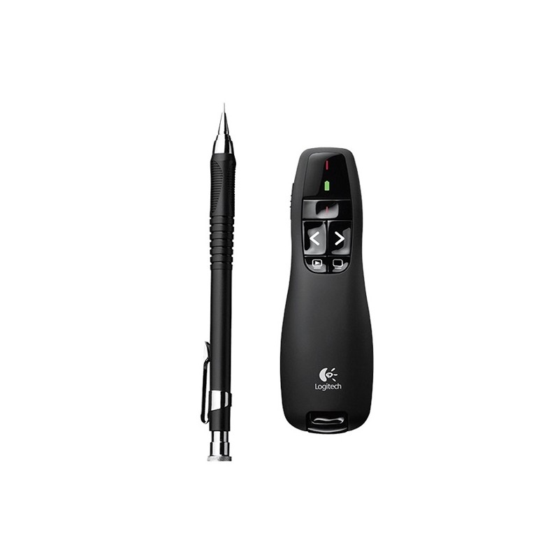 Prezentačné zariadenie Logitech ® Wireless Presenter R400 vám pomôže vyjadriť svoj názor. Vďaka intuitívne rozmiestneným ovládacím prvkom, ktoré možno ľahko nájsť po hmate, môžete prechádzať prezentácie s istotou. Logitech ® Wireless Presenter R400 - Pomôže vám vyjadriť svoj názor. Intuitívne ovládacie prvky prezentácie vám umožňujú prechádzať prezentáciou s istotou. Tlačidlá možno ľahko nájsť po hmate. Tvar skvele padne do ruky. Červené laserové ukazovadlo je dobre viditeľné na väčšine pozadí. Dosah až 15 metrov vám dáva možnosť voľne sa pohybovať po miestnosti a vmiesiť sa do publika a zvýšiť tak pôsobivosť prezentácie. Vďaka skladnému bezdrôtovému prijímaču s technológiou Plug and Play je inštalácia jednoduchá: stačí zapojiť prijímač do portu USB a môžete ho začať používať. Nemusíte inštalovať žiadny softvér. Po skončení prezentácie možno prijímač uložiť do prezentačného zariadenia, čo uľahčuje balenie. Technická špecifikácia Integrované ovládacie prvky prezentácie Účinný dosah 15 metrov a bezdrôtová technológia 2,4 GHz Červené laserové ukazovadlo s indikátorom Podpora technológie Plug and Play, nie je nutný software Skladný prijímač a cestovné puzdro Indikátor stavu batérií Vypínač napájania