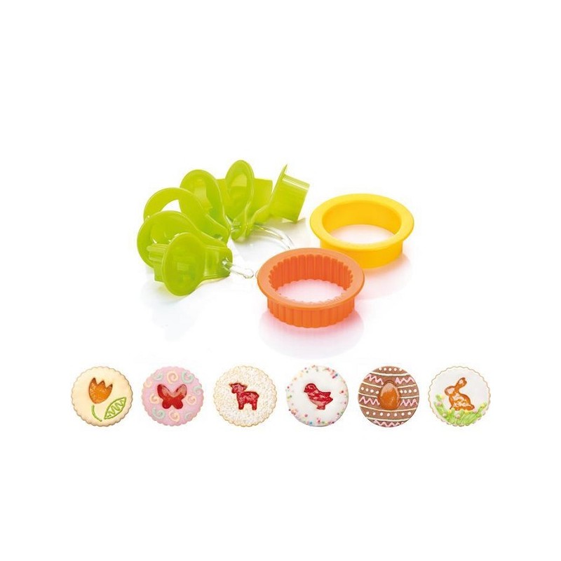 Praktické vykrajovače na linecké pečivo Delícia s veľkonočnými motívmi, ktoré vám budú nápomocné počas Veľkej noci. Vďaka plastovému materiálu, ktorý bol použitý počas výroby vykrajovača, Vám s vykrajovaním môžu bezpečne pomáhať aj deti. Súprava obsahuje dva okrúhle vykrajovače s rovným a vlnitým okrajom a 6 mini motívov na vykrojenie stredov. Súčasťou sady je plastový krúžok, na ktorý všetky vykrajovače ľahko zavesíte, vďaka tomu budete mať pospolu a ľahko ich uskladníte. Sada obsahuje veľkonočné motívy-baránka, motýlika, zajačika, kuriatko, kvet, vajíčko. Výrobok je vyrobený z prvotriedneho plastu.