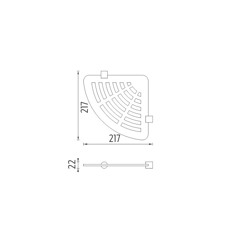 Rohová police s frézováním. Materiál plexiglass. 210x210 mm.