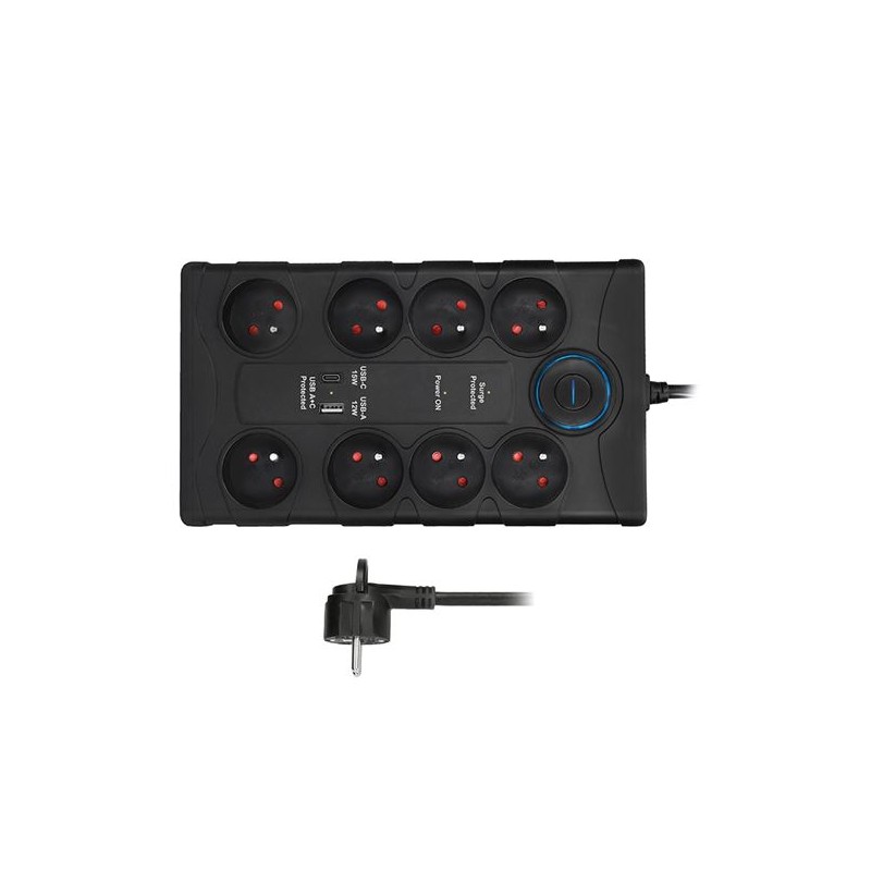 Prepätová ochrana s USB nabíjackou a 8 zásuvkami Spolahlivá prepätová ochrana s integrovanou USB nabíjackou chráni vaše zariadenie proti náhlym výkyvom napätia. Vdaka ôsmim zásuvkám a dvom USB portom je ideálny do domácnosti aj kancelárie. S maximálnou zátažou až 3680 W zvládne aj energeticky nárocnejšie spotrebice.Chytré funkcie a bezpecnost na prvom mieste Prepätová ochrana všetkých vodicov spolahlivo zachytí napätové špicky až do 2,2 kV. Integrovaný hlavný vypínac ovláda nielen zásuvky, ale aj USB výstupy. LED indikátory prehladne informujú o stave ochrany aj napájania. Resetovatelná tepelná poistka zaistuje ochranu pred pretažením pripojenými spotrebicmi.USB nabíjacka Vstavané porty USB-A a USB-C zvládnu nabíjat viac zariadení súcasne s celkovým výkonom až 17 W. Ochrana proti prehriatiu, prepätiu a skratu zarucuje bezpecné používanie aj pri dlhšom nabíjaní. USB porty sú taktiež chránené pred nežiaducimi napätovými špickami.Praktický dizajn na každodenné použitie Robustný, dva metre dlhý prívodný kábel poskytuje flexibilitu pri umiestnení. Dve oddelené zásuvky pojmú aj väcšie napájacie adaptéry bez prekážania ostatným zásuvkám. Výsuvný držiak na zadnej strane slúži na usporiadanie káblov, prípadne na zavesenie alebo prenášanie. Nechýbajú ani montážne otvory na pevné uchytenie.8 zásuviek 230V~16A s detskými poistkami 2 oddelené zásuvky pre velké adaptéry resetovatelná tepelná poistka chráni pred pretažením pripojenými spotrebicmi velký podsvietený vypínac ovláda elektrické zásuvky aj USB porty výsuvný držiak na usmernenie káblov, zavesenie alebo prenášanie montážne otvory na zadnej strane na pripevnenie k povrchu LED indikácia Prepätová ochrana aktívna, Zásuvky 230V chránené, USB A + C porty chránené prepätová ochrana Typ-3 (SPD Type-3) plná 3-pólová prepätová ochrana všetkých vodicov L-N, L-PE, N-PE maximálne napätie: trvalé Uc = 275V, ochranná úroven Up = 2,2kV, kombinovaný impulz Uoc = 4kV maximálny prúd: menovitý IN = 16A, maximálny vybíjací IMAX = 6.5kA zvodový prúd: 1mA, doba odozvy: 20ns absorpcia tepelného rázu: 370J USB A+C nabíjacka, DC 5V, max. 3.4A, max. 17W USB A+C spolocne USB-A: 5V-2.4A, 12W samostatne USB-C: 5V-3A, 15W samostatne PVC kábel 2m, H05VV-F 3x1.5mm2, max. 3680W farba: cierná