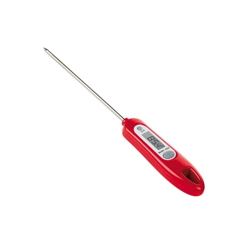 Meria rýchlo a presne teplotu od vnútra pokrmu, nápojov, omáčiek atď. vo °C alebo °F. Vyrobený z prvotriednej nehrdazvejúcej ocele a kvalitného plastu, vybavený LCD dispejom a ochranným krytom tlačidla, dodávaný s batériou. Odolný voči pare a vlhkosti, neumývajte v umývačke. 3 roky záruka.