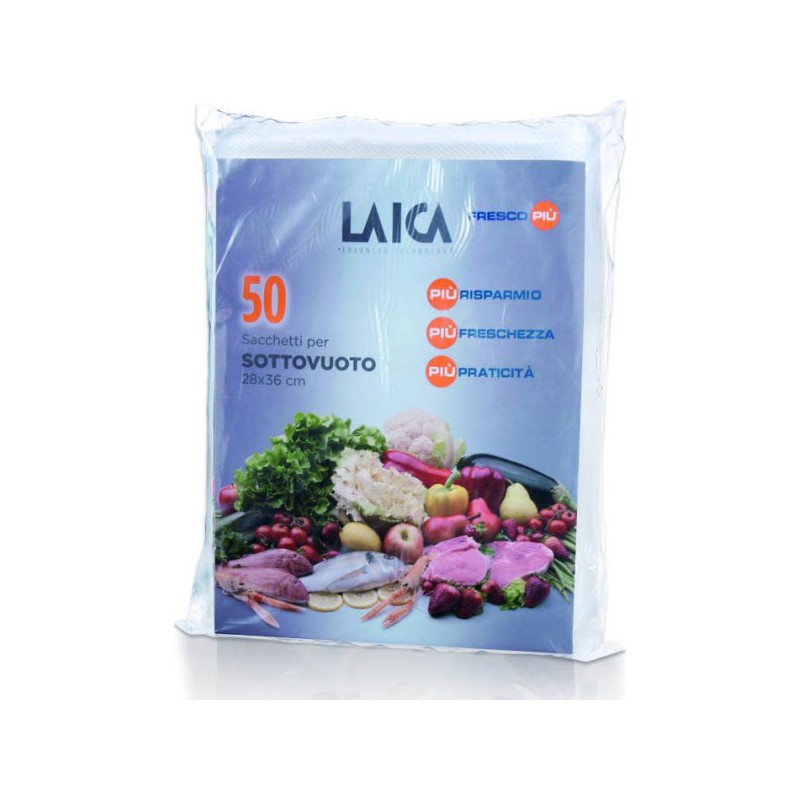 Špeciálne vakuovacie sáčky pre dlhodobé uskladnenie všetkých potravín. Sáčky sú umývateľné a opakovane použiteľné. Sú vhodné pre všetky vakuovačky LAICA a bežné vakuovacie zariadenia. Predĺžia životnosť potravín až 5x. 50 ks sáčkov, rozmer 28x36 cm Zdravotne nezávadný materiál, BPA free Certifikácia kvality Food Grade Možnosť použitia v mrazničke, chladničke Zabraňujú šíreniu pachov (vhodné pre zrejúce syry a údeniny) Vhodné pre techniku varenia sous-vide (voda pri 60°C po dobu 2h) Odolné teplotám do 100°C (vriaca voda max. 15 min)