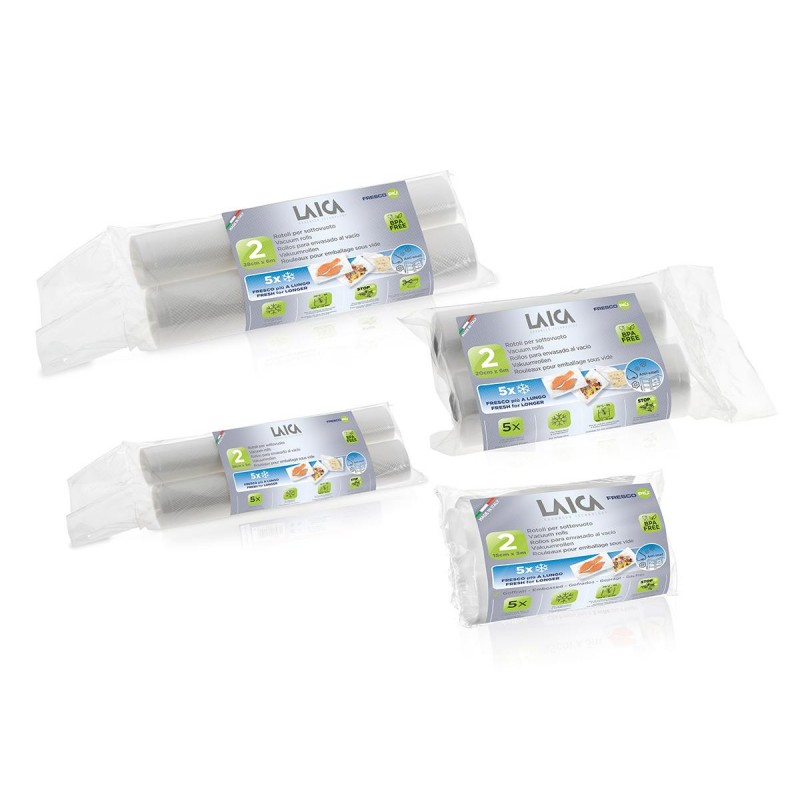 Špeciálne vakuovacie rolky pre dlhodobé uskladnenie všetkých potravín. Rolky sú umývateľné a opakovane použiteľné. Sú vhodné pre všetky vakuovačky LAICA a bežné vakuovacie zariadenia. Predĺžia životnosť potravín až 5x. Rolky 2 ks rozmer 20x600cm Určené pre vákuové uskladnenie všetkých potravín Rolky sú umývateľné (ručne) a opakovane použiteľné (okrem mäsa, rýb a mastných jedál) Kompatibilné so všetkými vákuovacími prístrojmi na domáce použitie Zdravotne nezávadný materiál, BPA free Certifikácia kvality Food Grade Možnosť uskladnenia v mrazničke, chladničke Rolky sú vhodné pre varenie vo vode na 100 ° C (max. 15 minút), pre varenie do 70°C (max. 6 hod.)