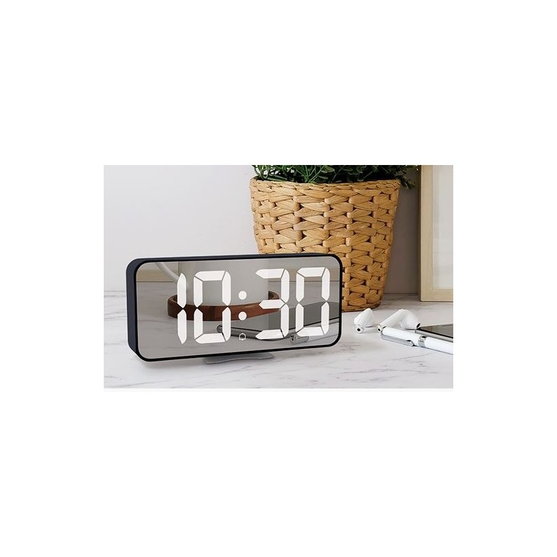 Digitále hodiny so synchronizáciou cez Bluetooth Hodiny so synchronizáciou cez Bluetooth a teplomerom. Digitálne hodiny automaticky synchronizujú čas prostredníctvom Bluetooth bez potreby aplikácie. Displej LED umožňuje prepínať medzi časom a teplotou a meria teplotu v rozsahu 0 °C - 50 °C (32 °F - 122 °F). Tri úrovne jasu a automatická regulácia jasu v nočnom režime zabezpečujú pohodlné používanie aj v noci. Denný budík s vypínačom ponúka jednoduché nastavenie. Napájanie 3× AAA batériami alebo cez DC 5V.digitálne hodiny s automatickou synchronizáciou času cez Bluetooth (bez nutnosti aplikácie) zrkadlový LED displej zobrazujúci čas alebo teplotu (možnosť prepínania zobrazenia) denný budík s možnosťou nastavenia a vypnutia možnosť prepínania jednotiek teploty: °C / °F rozsah merania teploty: 0°C – 50°C (32°F – 122°F) tri úrovne jasu LED displeja automatická regulácia jasu v nočnom režime (možnosť ručného nastavenia časového intervalu nočného režimu) napájanie: batéria: 3× AAA (LR03 - nie sú súčasťou balenia) napájací kábel pre USB adaptér DC 5V – 300mA (adaptér nie sú súčasťou balenia) USB port pre nabíjanie dalšieho zariadenia rozmery: 17,5*8,2*3,4cm farba čierna