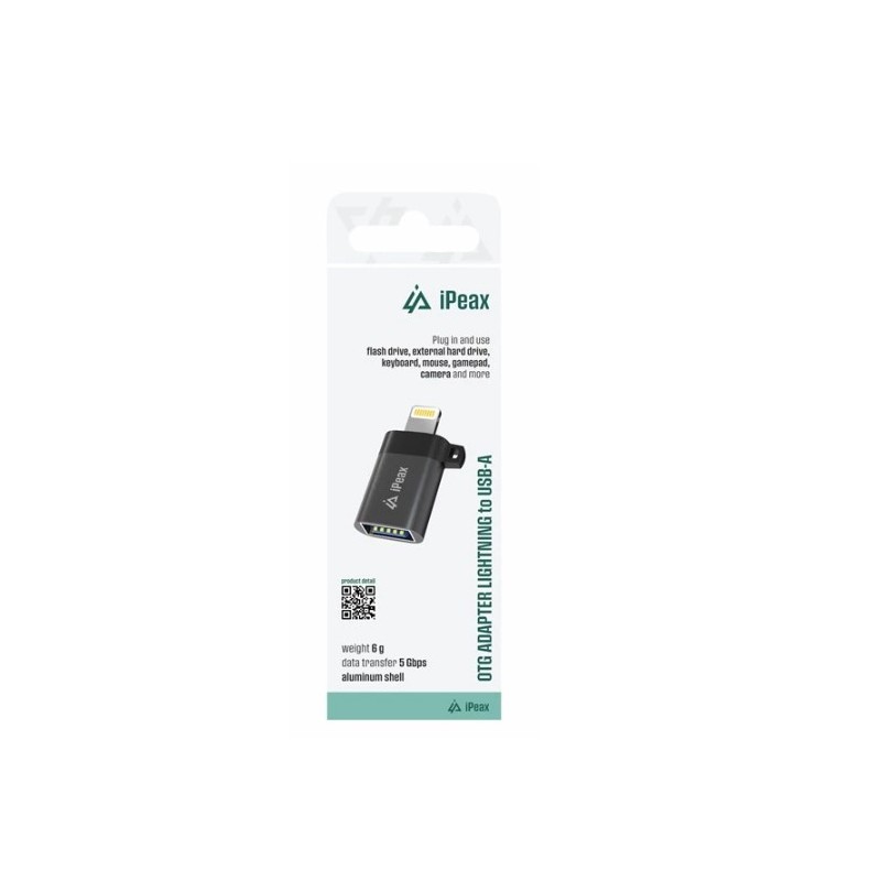 iPEAX OTG adaptér USB-A (samica) / LightningJednoduché pripojenie USB príslušenstva k iPhonu alebo iPadu S kompaktným iPEAX OTG adaptérom pripojíte flash disk, klávesnicu, čítačku kariet alebo napríklad mikrofón priamo do Lightning portu svojho Apple zariadenia. Podporuje dátový prenos rýchlosťou až 5 Gb/s vďaka štandardu USB 3.0, a to bez nutnosti inštalácie akýchkoľvek ovládačov.Kompaktný, ľahký a odolný Hliníkové telo v elegantnej čiernej farbe vyzerá skvele a zároveň chráni vnútornú elektroniku. Nízka hmotnosť 6 gramov z neho robí ideálny doplnok na cesty - ľahko sa zmestí do vrecka, tašky aj púzdra na tablet.Adaptér s konektorom Lightning (samec) a USB-A (samica). Podpora USB 3.0 s prenosovou rýchlosťou až 5 Gb/s. Umožňuje pripojiť USB príslušenstvo k iPhonu alebo iPadu. Odolný hliníkový plášť pre dlhú životnosť. Kompaktný a ľahký - váži len 6 gramov. Funkcia Plug Play bez nutnosti inštalácie.Technické parametre:Konektory: USB-A, Lightning USB Protokol: 3.0 Rýchlosť dátového prenosu: 5 Gb/s Hmotnosť: 6 g
