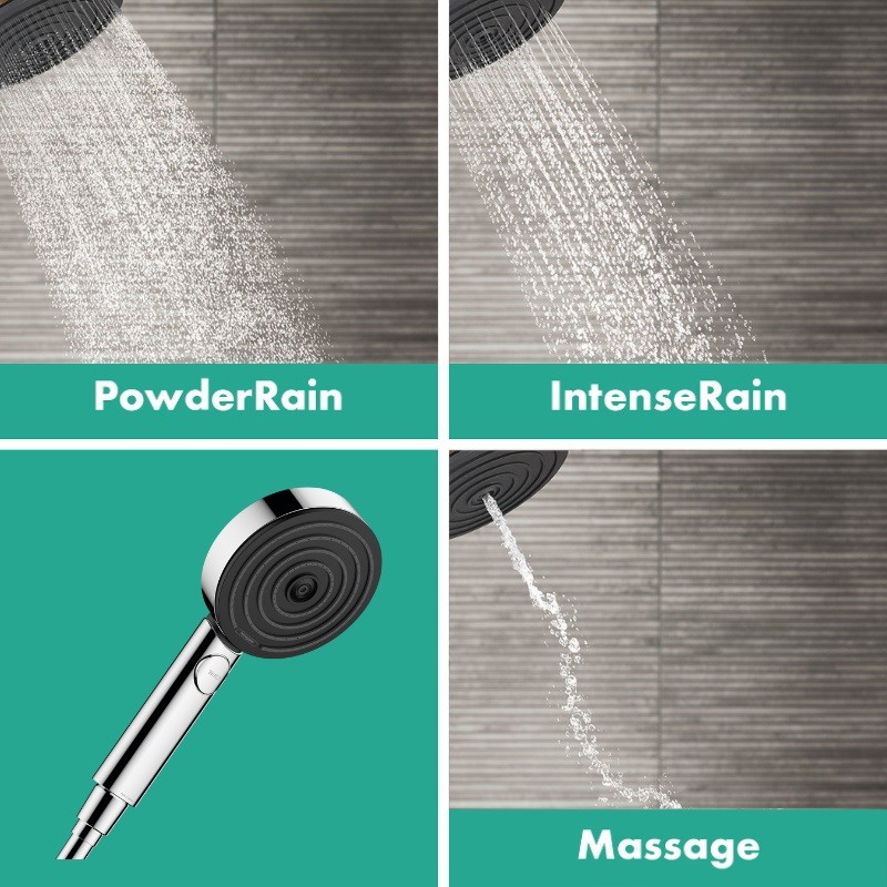Rôzne typy prúdov sa prepínajú tlačidlom (Select): Prúd hansgrohe PowderRain jemne zahalí telo do závoja z tých najjemnejších kvapôčok. Prúd IntenseRain používateľa povzbudí a je ideálny na spláchnutie šampónu. Výdatný masážny prúd na vás zapôsobí svojou silou.