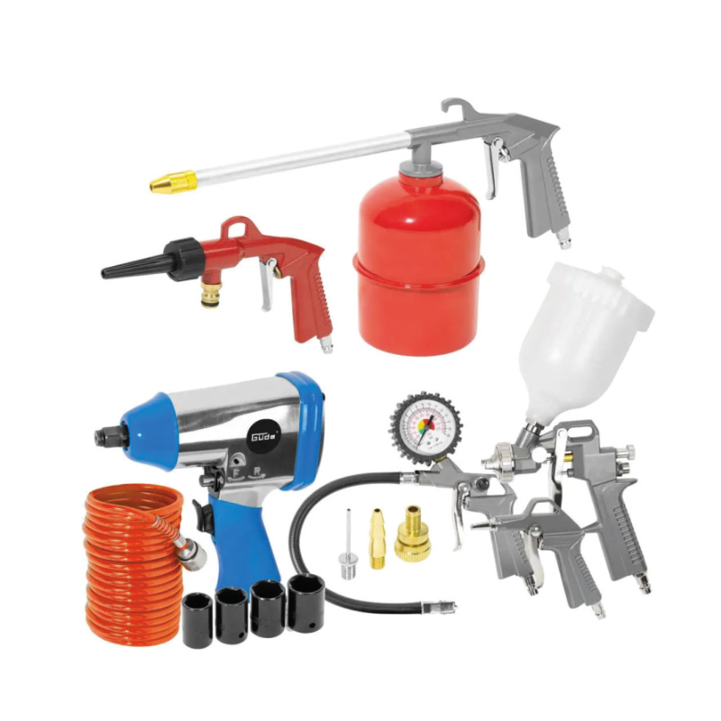 Sada pneumatického náradia obsahuje rázový uťahovák 1/2", nadstavce 15, 17, 19, 21 mm, špirálovú hadicu, striekaciu pištoľ na farby, striekaciu pištoľ na olej, vyfukovaciu pištoľ, hustilku pneumatík s manometrom, špičky na fúkanie lôpt, pištoľ na vodu.