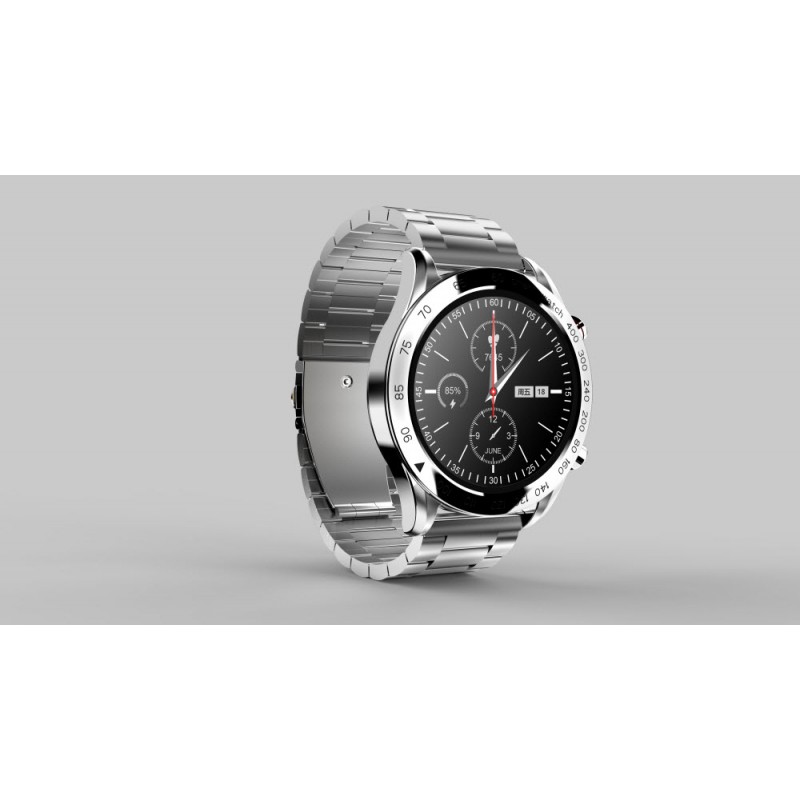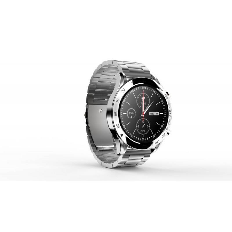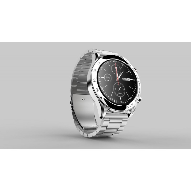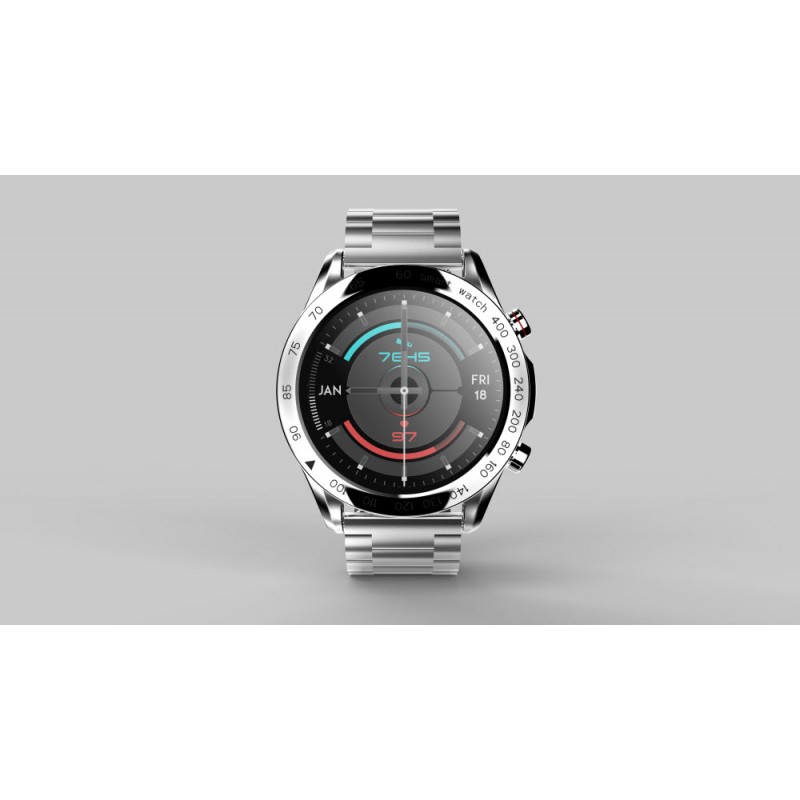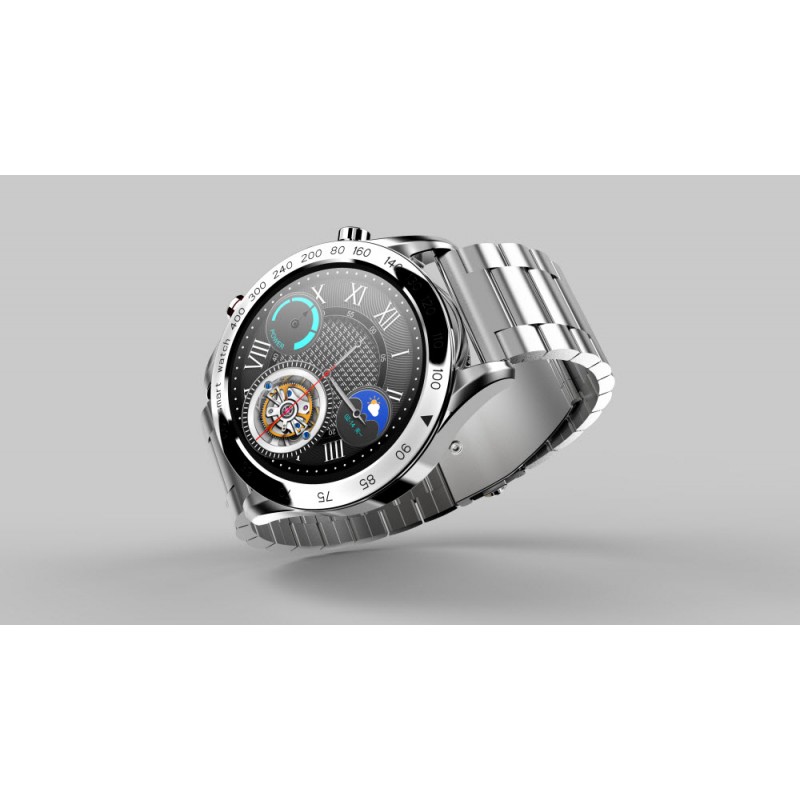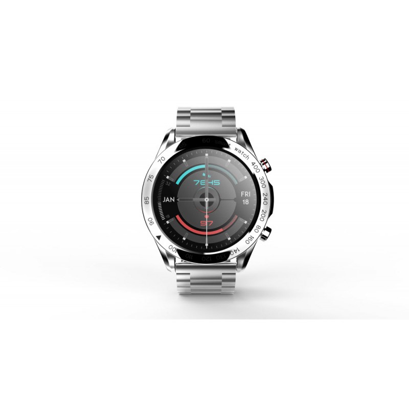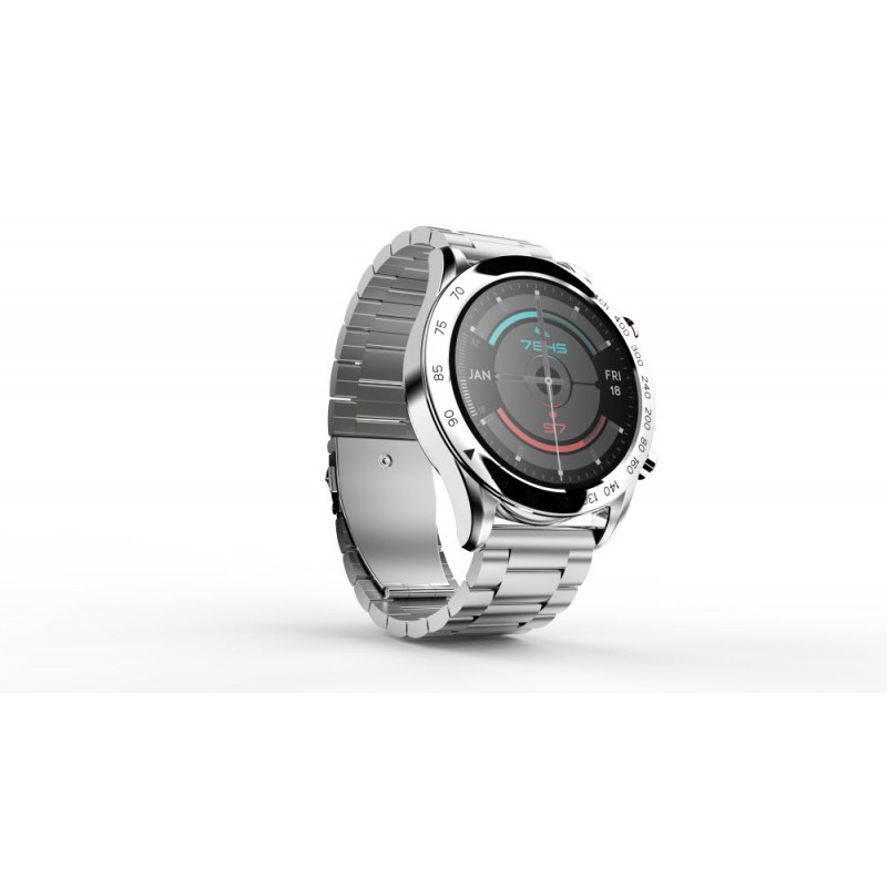 Inteligentné hodinky, 1,32" FHD displej, rozlíšenie 360 x 360 pixelov, Bluetooth v5.0, monitorovanie spánku, zdravie, športové režimy, podpora Bluetooth hovorov, remienok z nehrdzavejúcej ocele, krytie IP68, výdrž batérie až 20 dní, české a slovenské menu, kompatibilné s iOS a Androidom, vrátane nástrojov na výmenu remienka, šírka remienka 22 mm, aplikácia HiFutureFit, strieborná farba