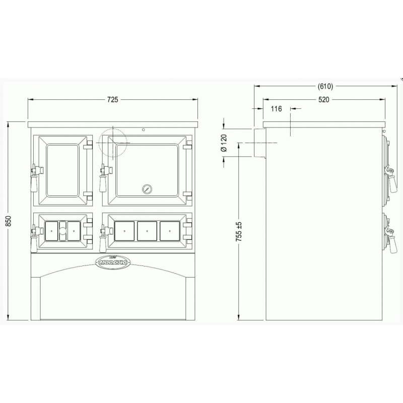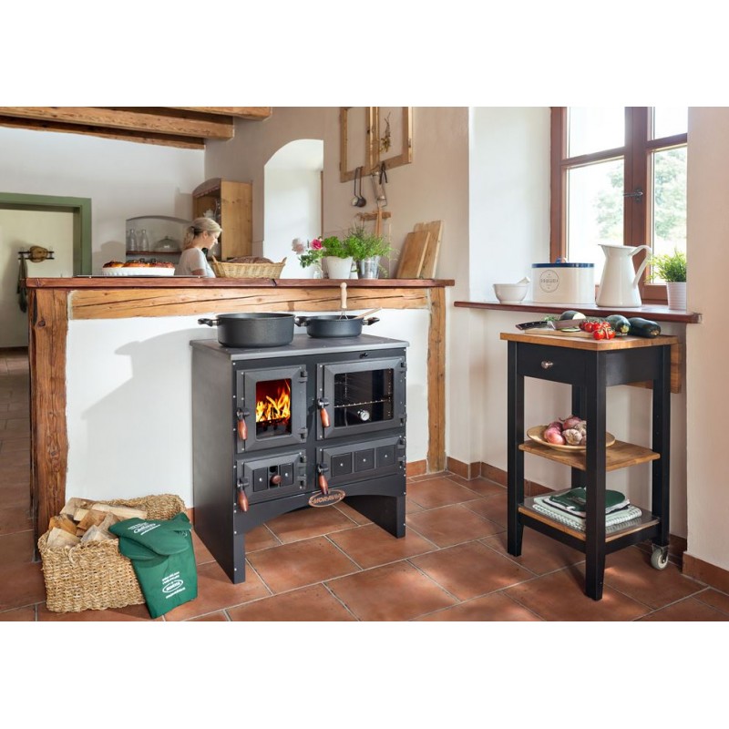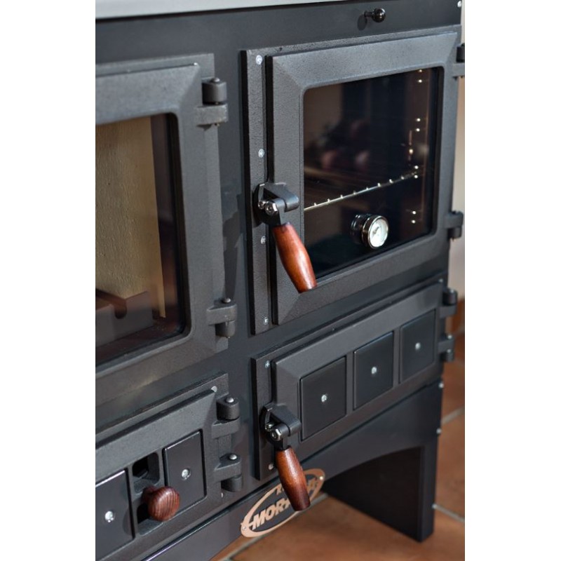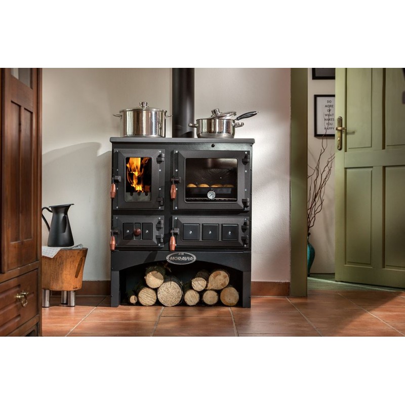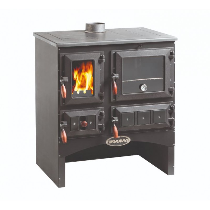 Charakteristické vlastnosti Dizajn v rustikálnom štýle Kúrenisko s pevným roštom pre palivové drevo dĺžky do 340 mm Jednoduchá regulácia toku spalín a výkonu Presklené dvierka ohniska pre vizuálnu kontrolu spotreby paliva Rúra s vynikajúcou schopnosťou pečenia Presklené dvierka rúry vybavené teplomerom Možnosť napojenia na komín so zadnej steny, prípadne z platne Sporák na pevné palivo s rúrou KVS MORAVIA typ 9170 Oliver je určený na vykurovanie, varenie, pečenie a ohrievanie pokrmov. Kúrenisko umožňuje použitie drevených polien s dĺžkou do 340 mm a priemerom do 160 mm.Sporák má už v štandardnom prevedení 2 vývody dymových splodín na napojenie na komín – zo zadnej steny alebo z platne. Vývod splodín je umiestnený symetricky v strede sporáka, preto nie je nutné určovať, či sa jedná o ľavú alebo pravú variantu jeho prevedenia.Sporák Oliver ocenia tí, ktorí nemajú dostatok priestoru pre veľký spotrebič. Je ideálne umiestniť ho do voľného priestoru, sálavé teplo do priestoru je vyžarované všetkými smermi najviac však spredu a platňou. echnické parametre Menovitý tepelný výkon (JTV): 6,6 kW Regulovateľný výkon: 6 – 8 kW Priemer dymového hrdla: 120 mm Rozmery kachlí (šxvxh): 725 x 850 x 575 mm Rozmery rúry (šxvxh): 300 x 250 x 420 mm Výška odťahového hrdla: 755 ± 5 mm (stredom od podlahy) Minimálny komínový ťah: 11 Pa Účinnosť pri JTV 81,5 % Hmotnosť: 107 kg Odporúčané palivo: drevo a drevené brikety Varianty prevedenia platne: oceľová Trieda energetickej účinnosti: A+