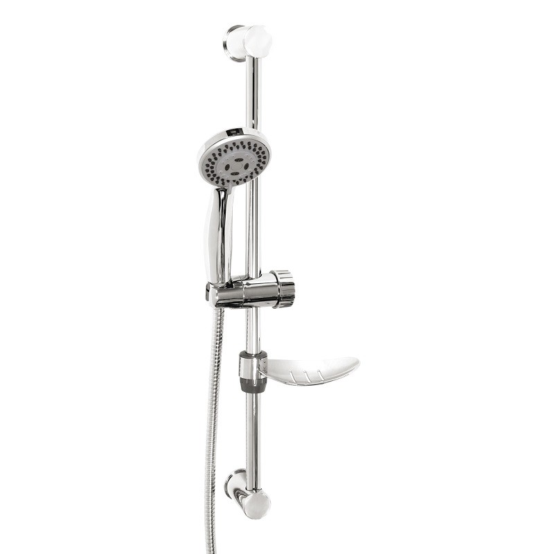 Súprava obsahuje 5 - polohovú sprchovú ružicu, posuvný držiak sprchy dĺžky 600mm, kovovú hadicu 150 cm a plastovú mydelničku. Balené v blistroch. Priemer tyče 19 mm. Rozstup montážnych otvorov cca 557 mm.