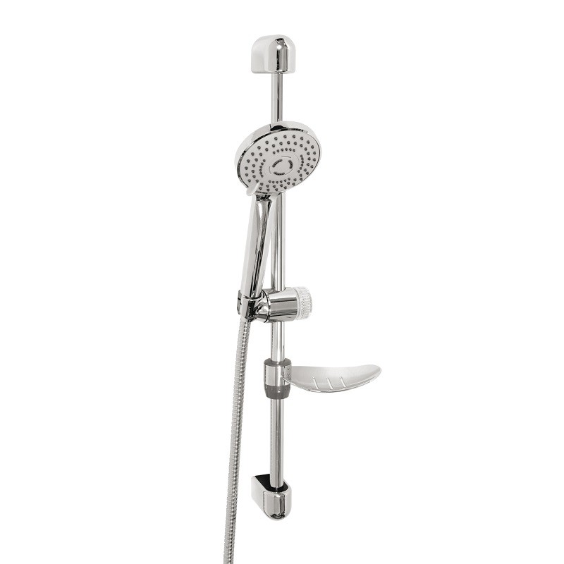 Súprava obsahuje 3 - polohovú sprchovú ružicu, posuvný držiak sprchy dĺžky 615mm, kovovú hadicu 150 cm a plastovú mydelničku. Balené v blistroch. Priemer tyče 18 mm. Rozstup montážnych otvorov cca 595 mm.
