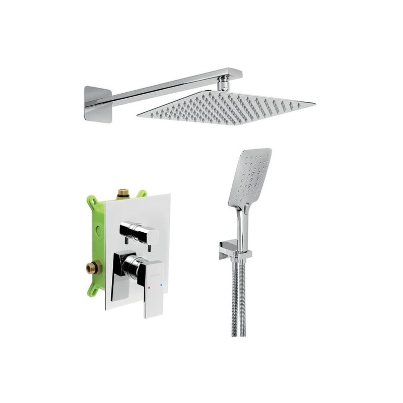 Sprchová podomietková sada s príslušenstvom. Box je dodávaný spolu s krytom a ovládacou pákou. Sada obsahuje podomietkovú sprchovú batériu s kvalitnou keramickou kartušou s 5 ročnou zárukou a šikovným keramickým prepínačom, kovovú hadicu 150 cm, ramienko zo zdi v dĺžke 400 mm, hlavovú sprchu vo SLIM dizajne v rozmere 250 x 250 mm, úspornú ručnú sprchu a hranatý stenový vývod vody s držiakom na ručnú sprchu.