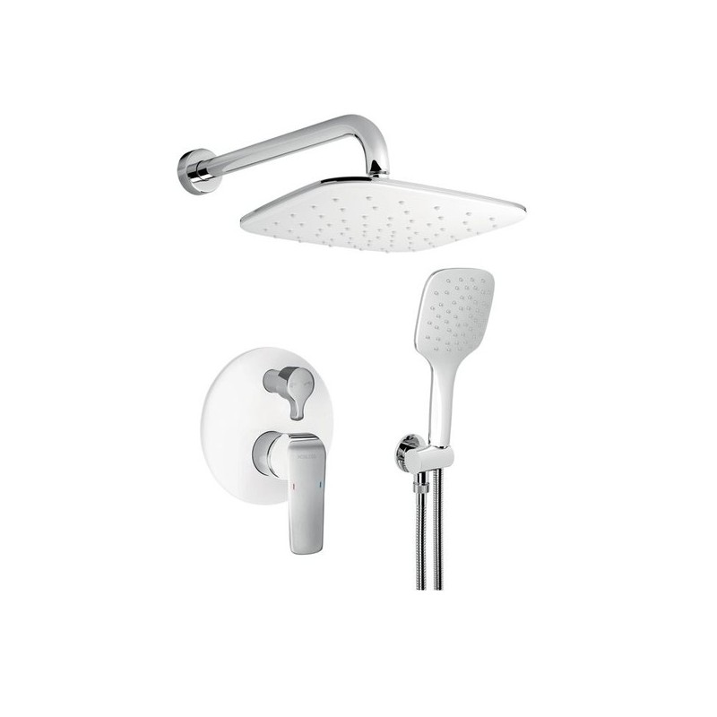 Sprchová podomietková sada s príslušenstvom v prevedení chróm. Sada obsahuje podomietkovú sprchovú batériu s kvalitnou keramickou kartušou s 5 ročnou zárukou a šikovným keramickým prepínačom s podomietkovým pripojením 1/2", kovovú hadicu 150 cm, ramienko zo zdi v dĺžke 350 mm, hlavovú sprchu v rozmere 250 x 250 mm, ručnú sprchu a stenový vývod vody s držiakom na ručnú sprchu.