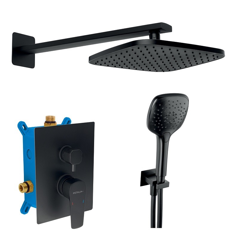 Sprchová podomietková sada s príslušenstvom v prevedení čierna-mat. Box je dodávaný spolu s krytom páky a prepínača. Sada obsahuje podomietkovú sprchovú batériu s keramickou kartušou KEROX so 7 ročnou zárukou, hadicu 150 cm, hlavovú sprchu v rozmere 230 x 230 mm, úspornú ručnú 3-polohovú sprchu a hranatý stenový vývod vody s držiakom na ručnú sprchu.