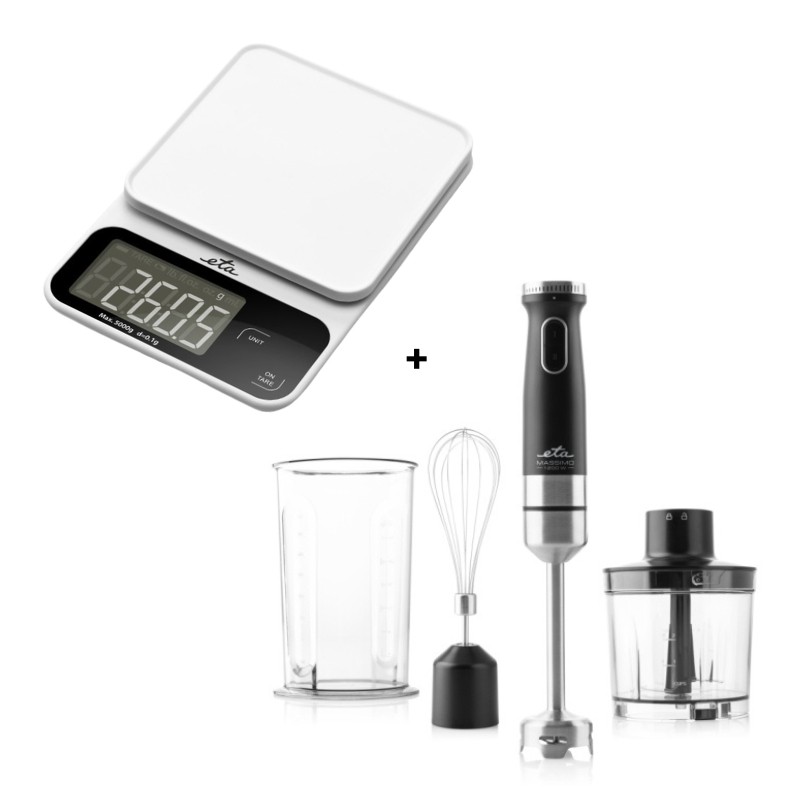 SET sa skladá :- mixér tyčový ETA 325690000 MASSIMO Príkon 1200 W • DC motor • plynulá regulácia otáčok • TURBO PRÍSLUŠENSTVO: nerezový tyčový mixér, metla na šľahanie, pracovná nádoba o objeme 700 ml, sekáčik 500 ml • farba: nerez- váha kuchynská ETA POPI 677090000 Rozsah merania do 5 kg • rozlíšenie 1 g • funkcia TARE • LCD displej • jednotky merania: g / oz / fl.oz / ml / ml milk (mlieko) • dotykové ovládanie • indikátor preťaženia a slabej batérie • 2 x batéria AAA • farba: biela