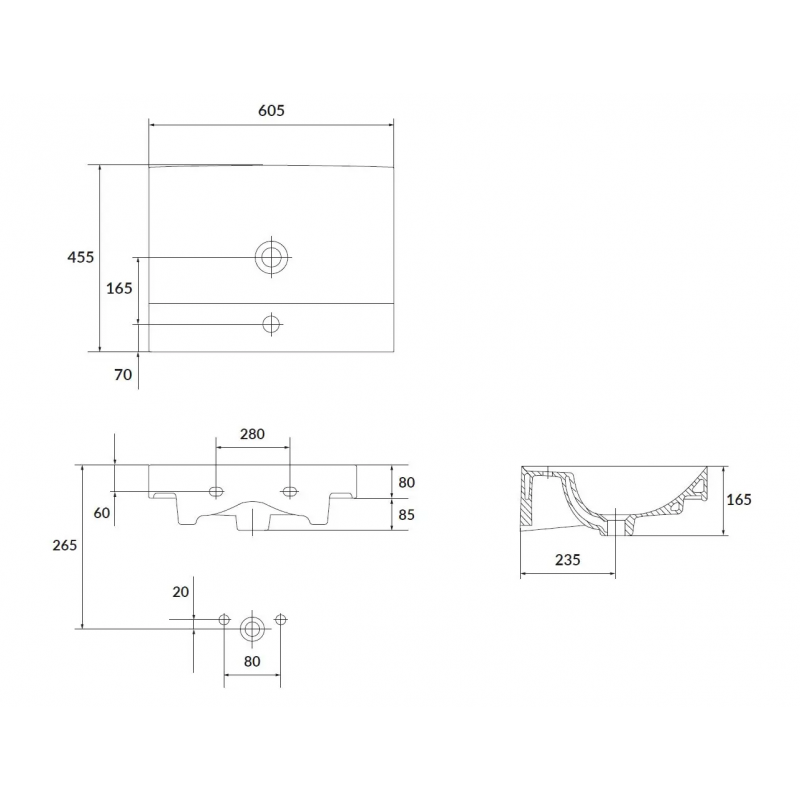 Závesné / nábytkové umývadlos 1 otvorom na batériu s prepadom rozmer: 605 x 455 mm inštalácia na stenu alebo na skrinku pod umývadlo kielle PureShield - antibakteriálna keramika s prídavkom iónov striebra Batéria nie je súčasťou dodávky.