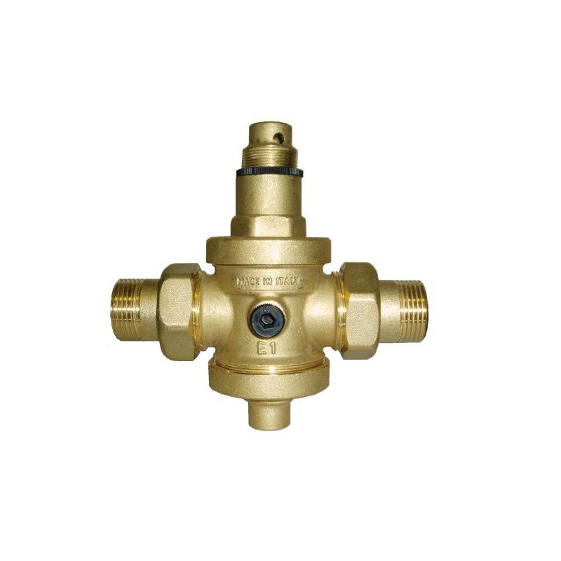 Tlakové mosadzné redukčné ventily udržujú konštantný výstupný tlak na úrovni nastaviteľnej v rozsahu 1,2-6,0 Baru (výrobné nastavenie 3 Bary). Možnosť pripojenia manometra G 1/4" indikujúceho výstupný tlak. Inštalácia redukčného ventilu: Gravitácia nemá na prevádzku redukčných ventilov žiadny vplyv a preto môžu byť v systéme inštalované do akejkoľvek polohy. Redukčný ventil môže byť poškodený nečistotami, ktoré sa vyskytujú vo vode a preto z dôvodu jeho ochrany a všetkých zariadení na výstupe systému odporúčame inštalovať na vstupe redukčného ventilu samočistiaci filter. Ďalej odporúčame nainštalovať do systému zariadenie proti vodnému rázu z dôvodu ochrany vnútorných súčiastok redukčného ventilu. Nastavenie tlaku redukčného ventilu. Všetky redukčné ventily Malgorani sú pred balením testované na skúšobnom zariadení a nastavené na výstupný tlak 3 bary. Potom, čo sa redukčný ventil nainštaluje do systému, dá sa tlak na výstupe jednoducho upraviť. Ak chcete zmeniť tlak na výstupe, stačí povoliť aretačný krúžok a otáčať nastavovacou skrutkou. Otáčaním v smere hodinových ručičiek sa tlak na výstupe zvyšuje a naopak otáčaním proti smeru hodinových ručičiek sa tlak znižuje. Správny tlak sa nastavuje pri uzavretom systéme. Mosadzný redukčný ventil s piestom z nerezovej ocele, s dvoma vonkajšími (MM) závitmi. Možnosť pripojenia manometra so závitom G1/4" PN: 25 bar Výstupný tlak: 0,5 - 6 bar Výrobné nastavenie: 3 bar Max prac. teplota: 80° C (110° C v špeciálnom prevedení) Dostupné dimenzie: 1/2" až 2 1/2" Materiál: mosadz
