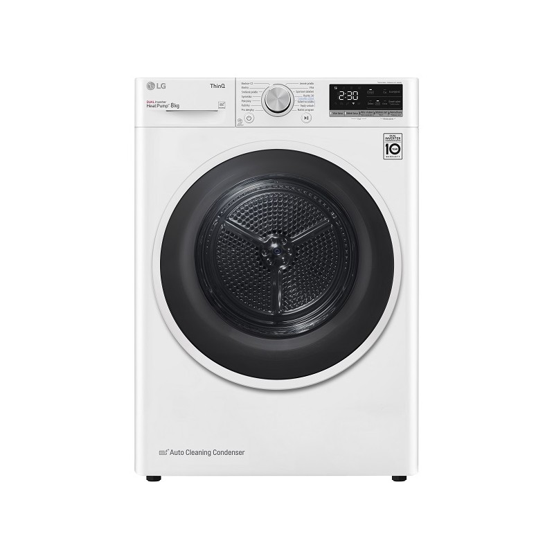 Typ kondenzačná Kapacita 8 kg Tepelné čerpadlo/Hybridné sušenie ÁNO / ÁNO Energetická trieda A+++ (v rozsahu A+++ až D) Spotreba energie (cyklus) 176 kWh/rok Displej LED – dotykový Čas sušenia - max. náplň 181 min./cyklus Čas sušenia (Energy mode) až 26,8 min/kg Čas sušenia (Time mode) až 18,5 min/kg Objem zásobníka na kondenzát 4,9 litrov Hlučnosť sušenia 62 dB TECHNOLÓGIE Duálne invertorové tepelné čerpadlo a invertorový motor – (10 r. záruka na motor/kompresor) Eco Hybrid™ - hybridné sušenie – úspora energie, alebo času Funkcia automatického čistenia kondenzátora – až 3x za cyklus LG ThinQ + Wi-Fi pripojenie – ovládanie na diaľku, načítanie programu a inteligentná diagnostika (Smart Diagnosis™ 3.0) Program pre alergikov – redukcia až 99,9 % alergénov (BAF certifikácia) Inteligentný elektronický systém sušenia, Zvuková signalizácia ukončenia programu, Ukazovateľ zostatkového času a priebehu sušenia, Ukazovateľ zanesenia filtra, Ukazovateľ naplnenia nádoby na kondenzát, Veľké dvierka, Nerezový bubon, Rotácia bubna v oboch smeroch 14 PROGRAMOV Bavlna+, Bavlna, Zmiešaná bielizeň, Syntetika, Prikrývky, Uteráky, Pre alergikov, Rýchly 30, Športové oblečenie, Vlna, Jemná bielizeň, Sušenie na sušiaku, Teplý vzduch + Načítať program (cez Wi-Fi) Ďalšie programy na stiahnutie cez Wi-Fi (smartphone, aplikácia LG ThinQ) 13 PRÍDAVNÝCH MOŽNOSTÍ + 3 MOŽNOSTI SUŠENIA Odložený štart, Starostlivosť o kondenzátor, Starostlivosť o bubon, , Nekrčivý, Svetlo bubna, Viac času, Menej času, Zvuková signalizácia on/off, Wi-Fi: Diaľkový štart, (stiahnutie programu + Smart Diagnosis), Detská poistka EcoHybrid: Energia/Čas Možnosti sušenia: Žehlenie, Skriňa, Extra Možnosť otočenia dverí ÁNO Možnosť pripojenia na odpad ÁNO Držiak na sušenie NIE / odt. hadica NIE/ spojovacia sada NIE Predávané samostatne Rozmery (š x h x v) 600 × 690 × 850 mm Farba biela + čierne dvierka s bielym lemom
