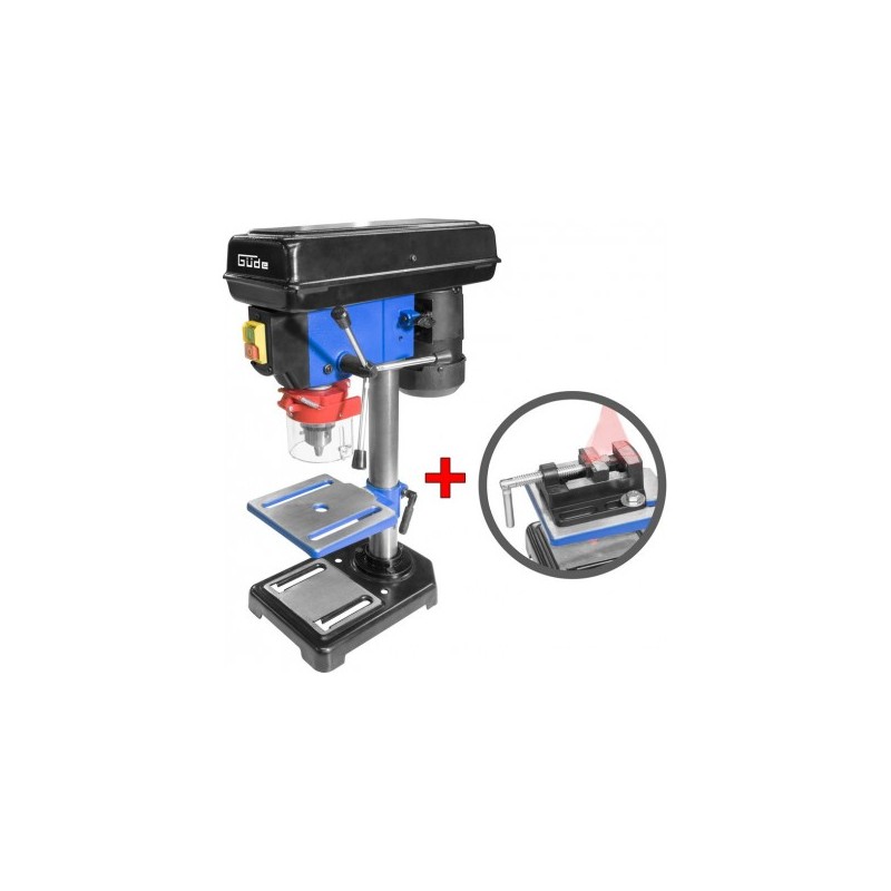 Pohon klinovým remeňom, zmena otáčok stupňami remenice, systém napínania klinového remeňa. Vŕtacie vreteno uložené v guľôčkových ložiskách. Výškovo prestaviteľný stôl. Nastaviteľný hĺbkový doraz pre presné vŕtanie. Veľkosť pätky 190 x 300 mm s otvormi pre upevnenie zveráka. Sklopný štít. Hlavný vypínač s ochranou pred nulovým napätím. Polohovací laser pre presné vŕtanie. Vrátane zveráka 2,5". Technické údaje: Sieťové napätie: 230 V Frekvencia: 50 Hz Druh prevádzky: S2 15min Trieda ochrany: I Výkon motora P1: 550 W Otáčky motora: 550-2500 1/min Zdvih vretena: 50 mm Počet stupňov: 5 Vyloženie: 104 mm Max. upínací priemer skľučovadla: 16 mm Min. upínací priemer skľučovadla: 3 mm Max. vzdialenosť skľučovadla od stola: 175 mm Max. vzdialenosť skľučovadla od pätky: 260 mm Uhol skľučovadla: 16 B Upínanie na vretene: 2 MK Šírka stola: 164 mm Dĺžka stola: 162 mm Naklápanie stola: +/- 45° a výkyvný 360° Pätka ŠxD: 190 x 298 mm Priemer stĺpa: 46 mm Celkové rozmery (ŠxDxV): 225 x 445 x 590 mm Hmotnosť netto/brutto: 15,5 kg/17 kg