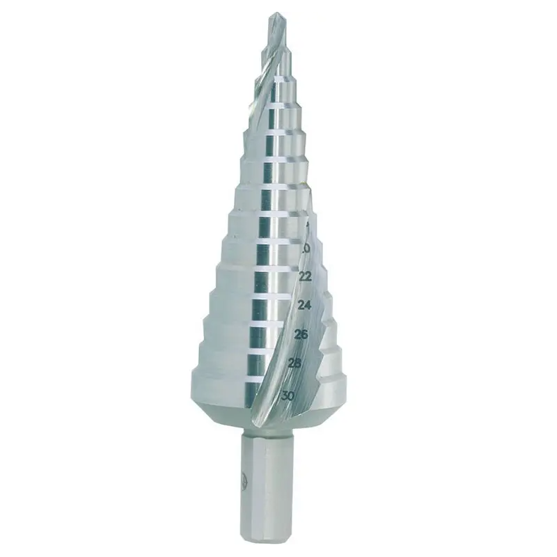 Vrták stupňovitý HSSCo5 4-30mm/14st. 4-6-8-10-12-14-16-18-20-22-24-26-28-30 stopka 10mm Stupňovitý vybrusovaný vrták s vybrúsenou skrutkovitou drážkou ponúka veľký výkon a veľmi pokojný záber pri vŕtaní, pričom skrutkovitá drážka súčasne prispieva k dobrému deleniu a rýchlemu odvodu vzniknutej triesky.Vyrobené podľa normy DIN 1412 z materiálu HSSCO5